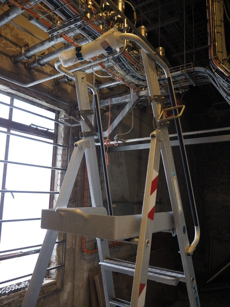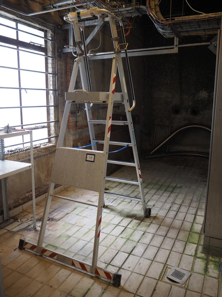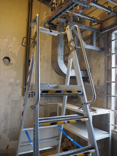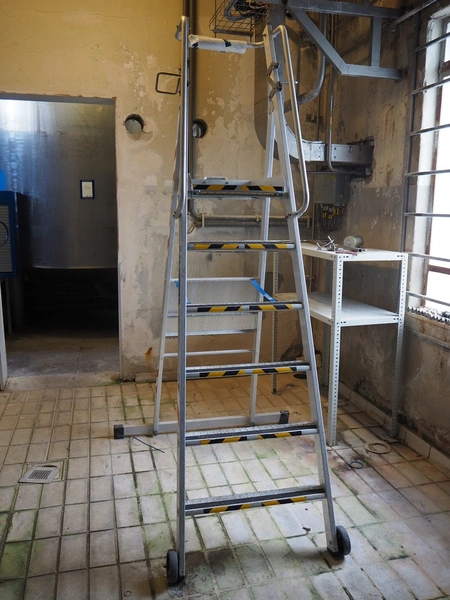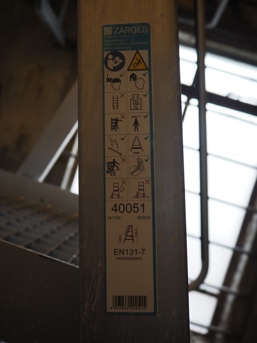 Zarges aluminium ladder, maximum capacity: 150 kg, working height: 1600 mm, total dimensions: 1500 mm x 800 mm x 2400 mm.