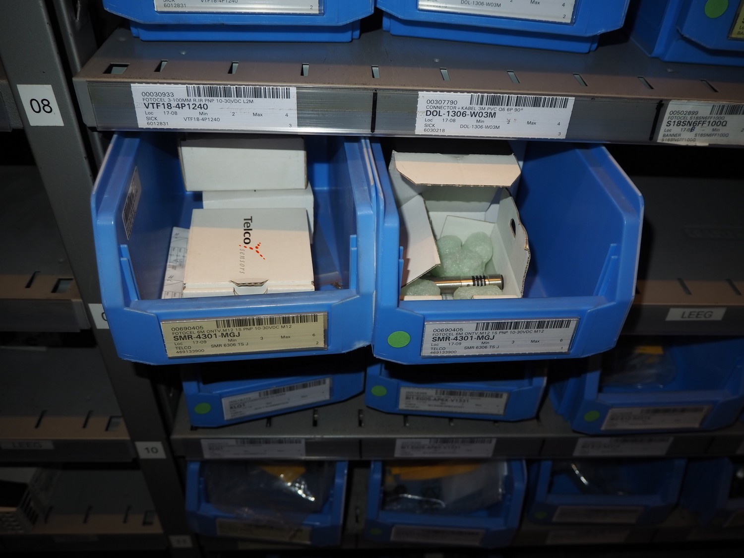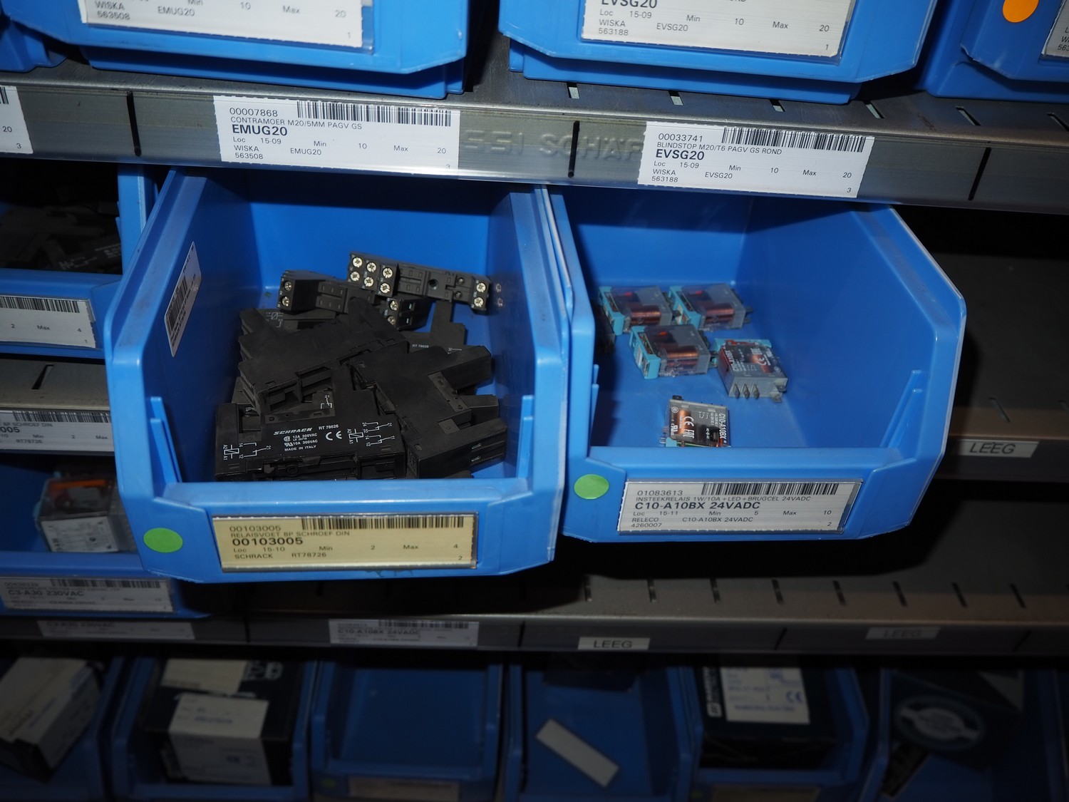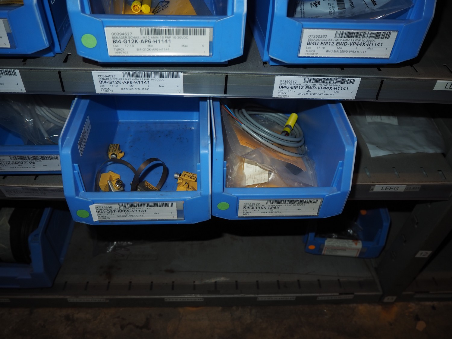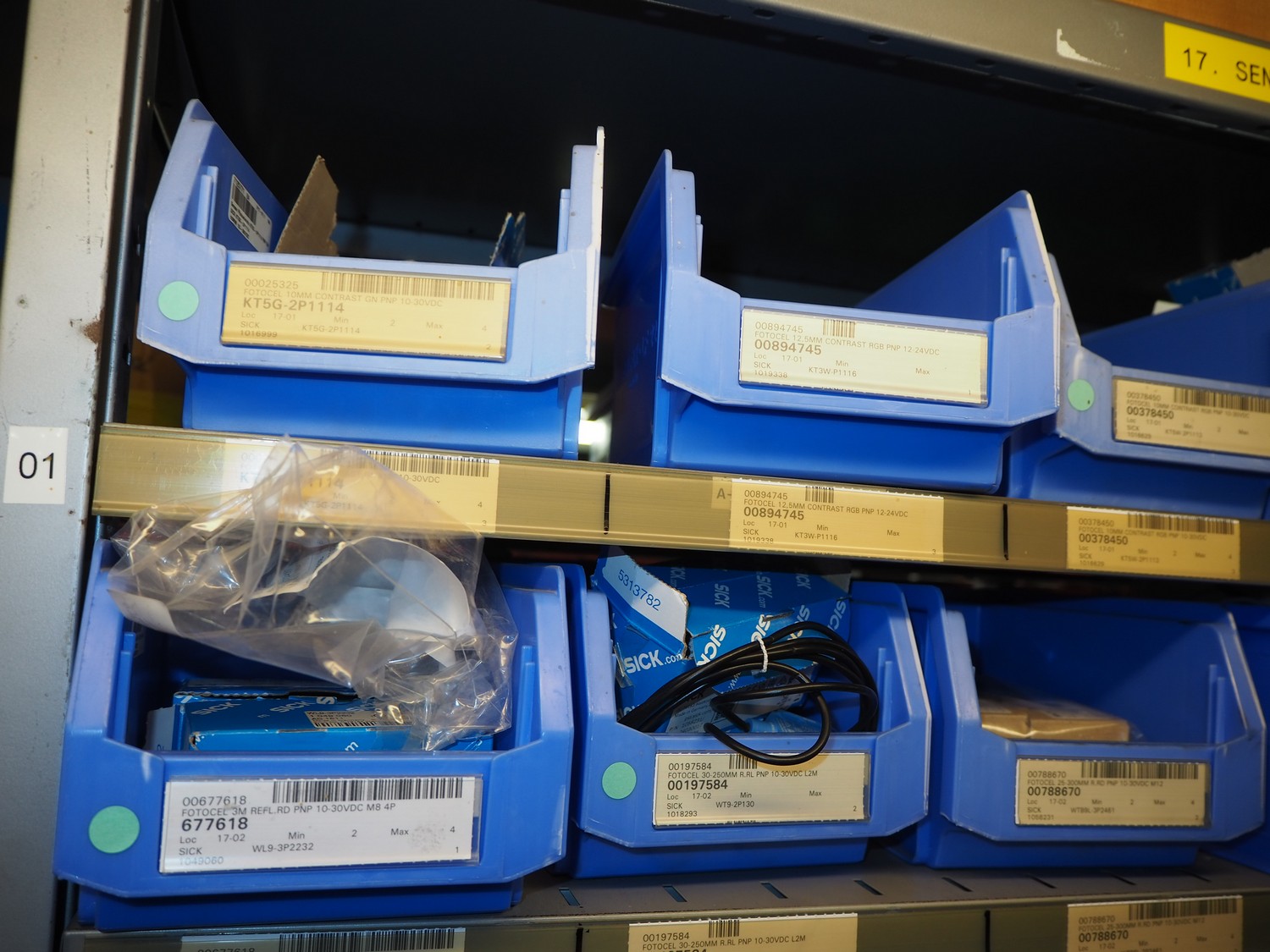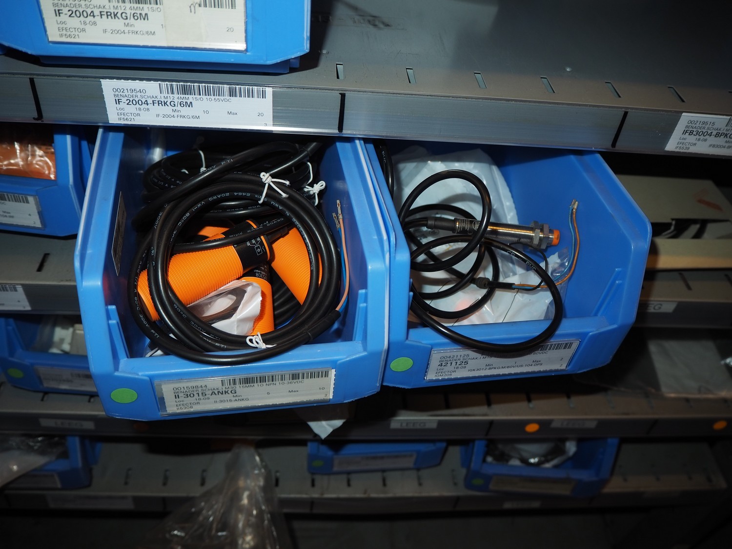 Steel racks with large amount of electrical parts, sensors, brands among others, dimensions: 7250 mm x 1000 mm x 2170 mm.