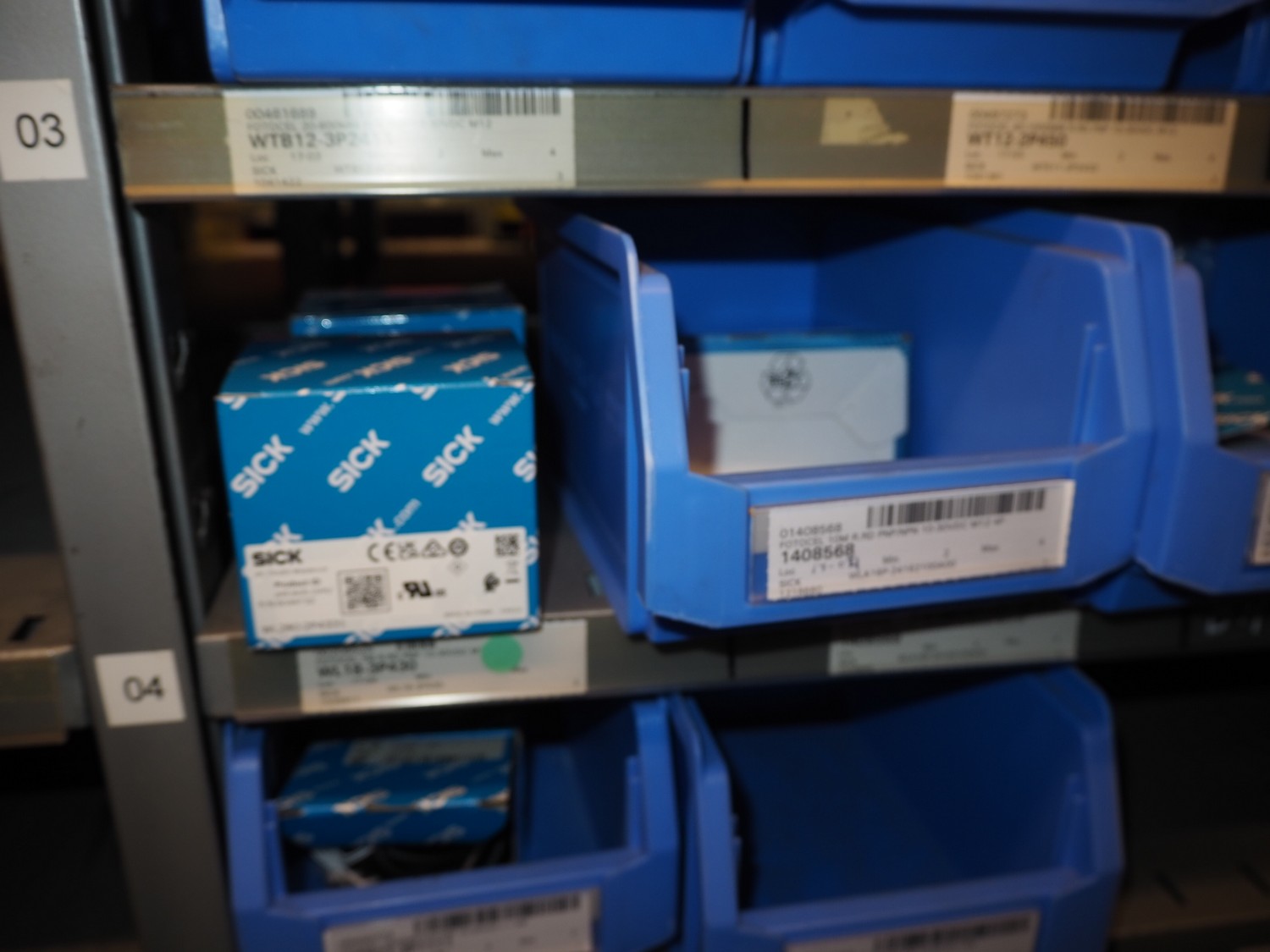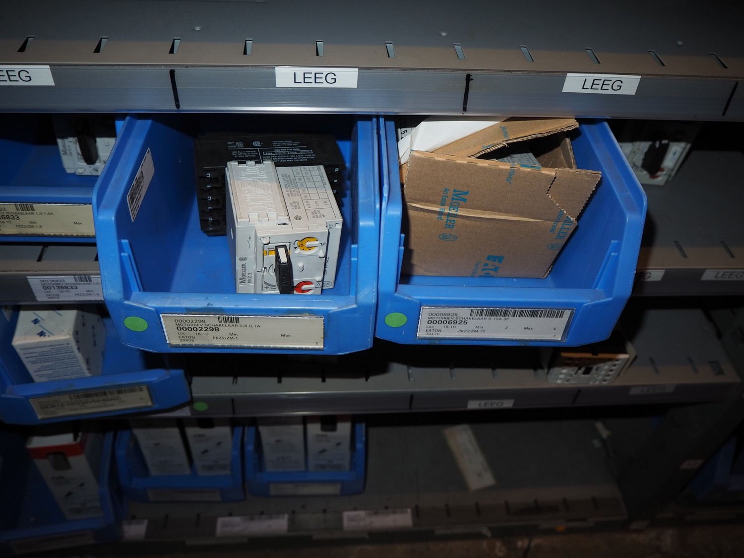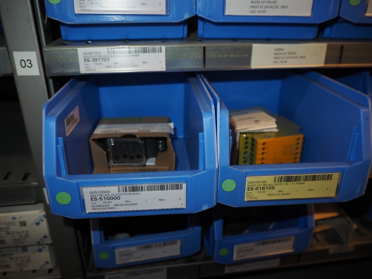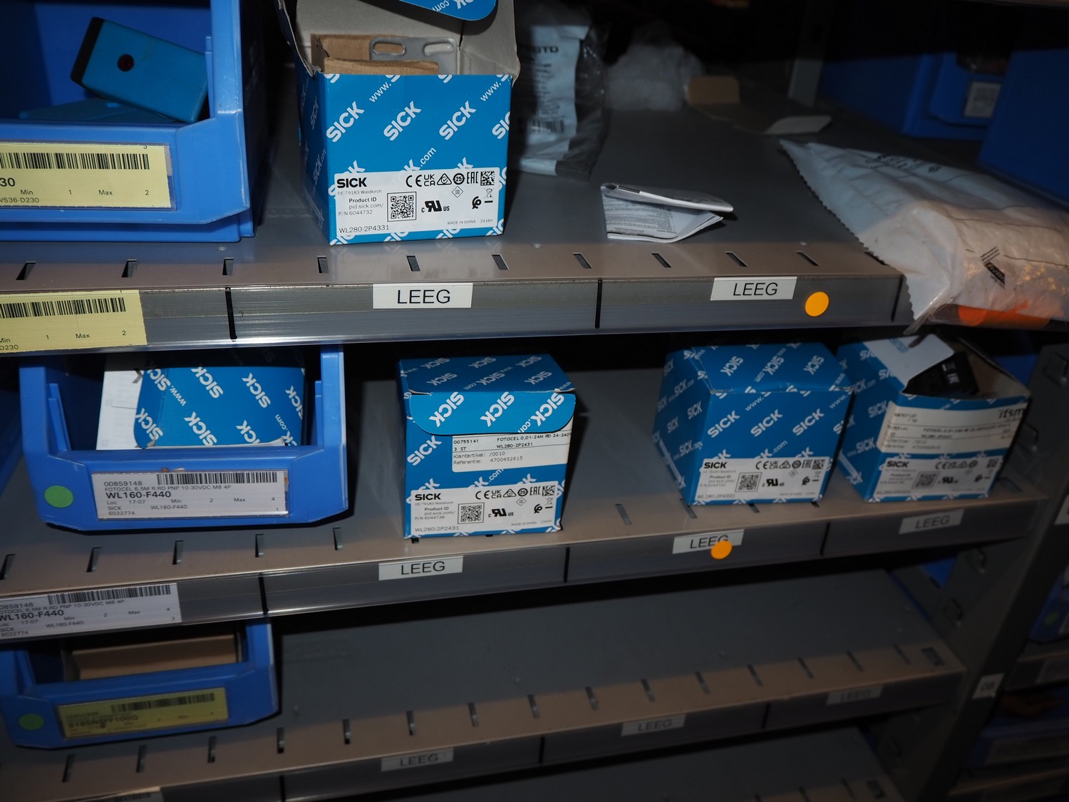 Steel racks with large amount of electrical parts, sensors, brands among others, dimensions: 7250 mm x 1000 mm x 2170 mm.