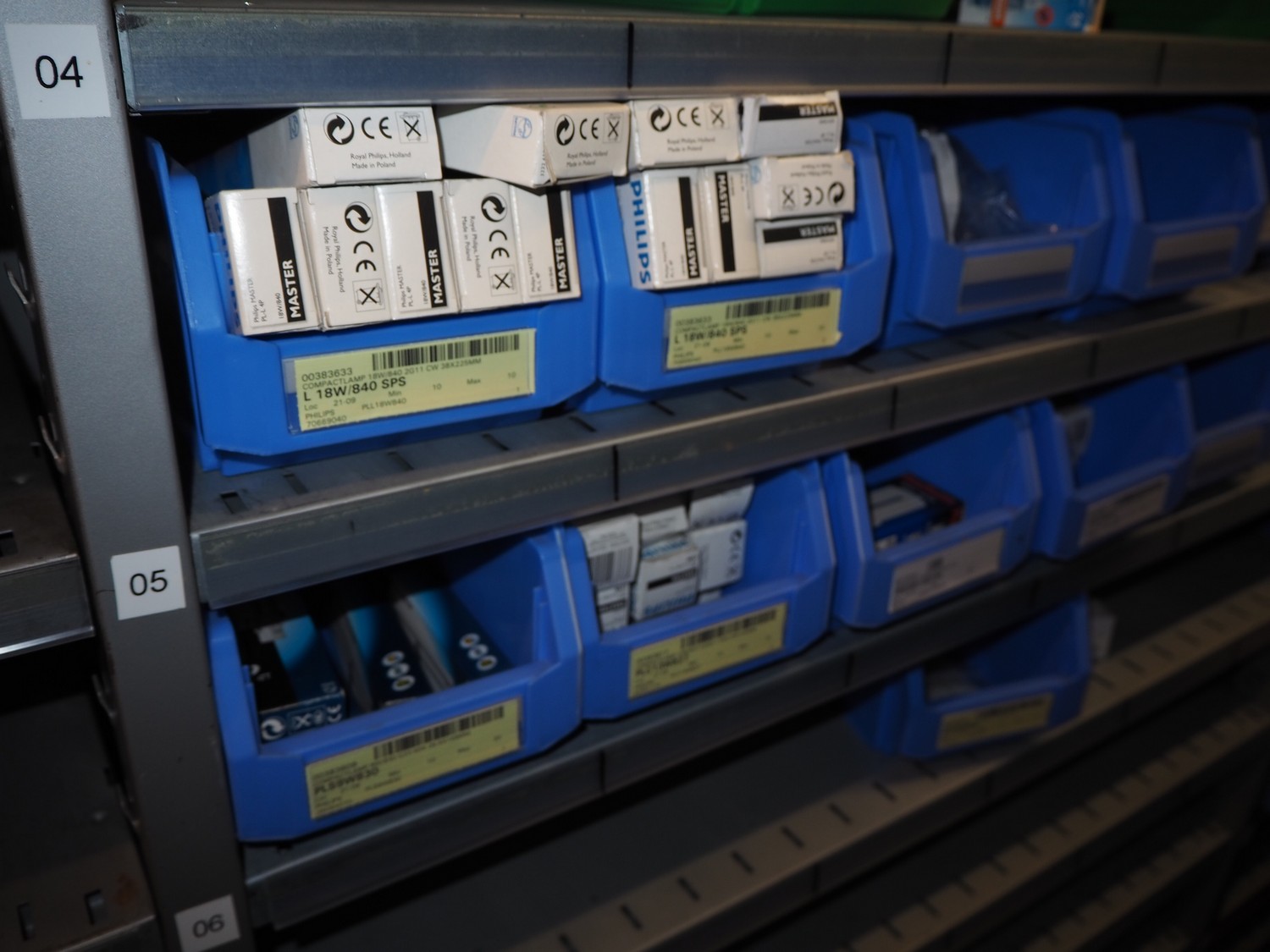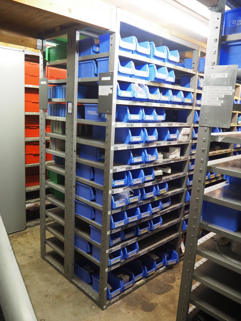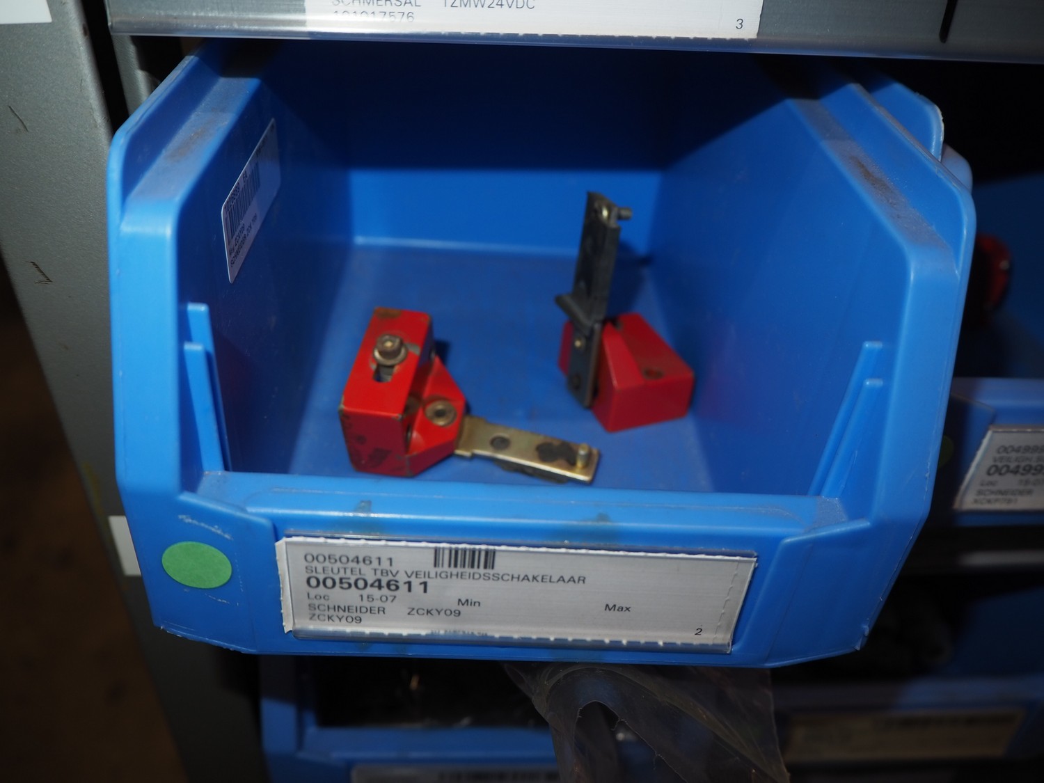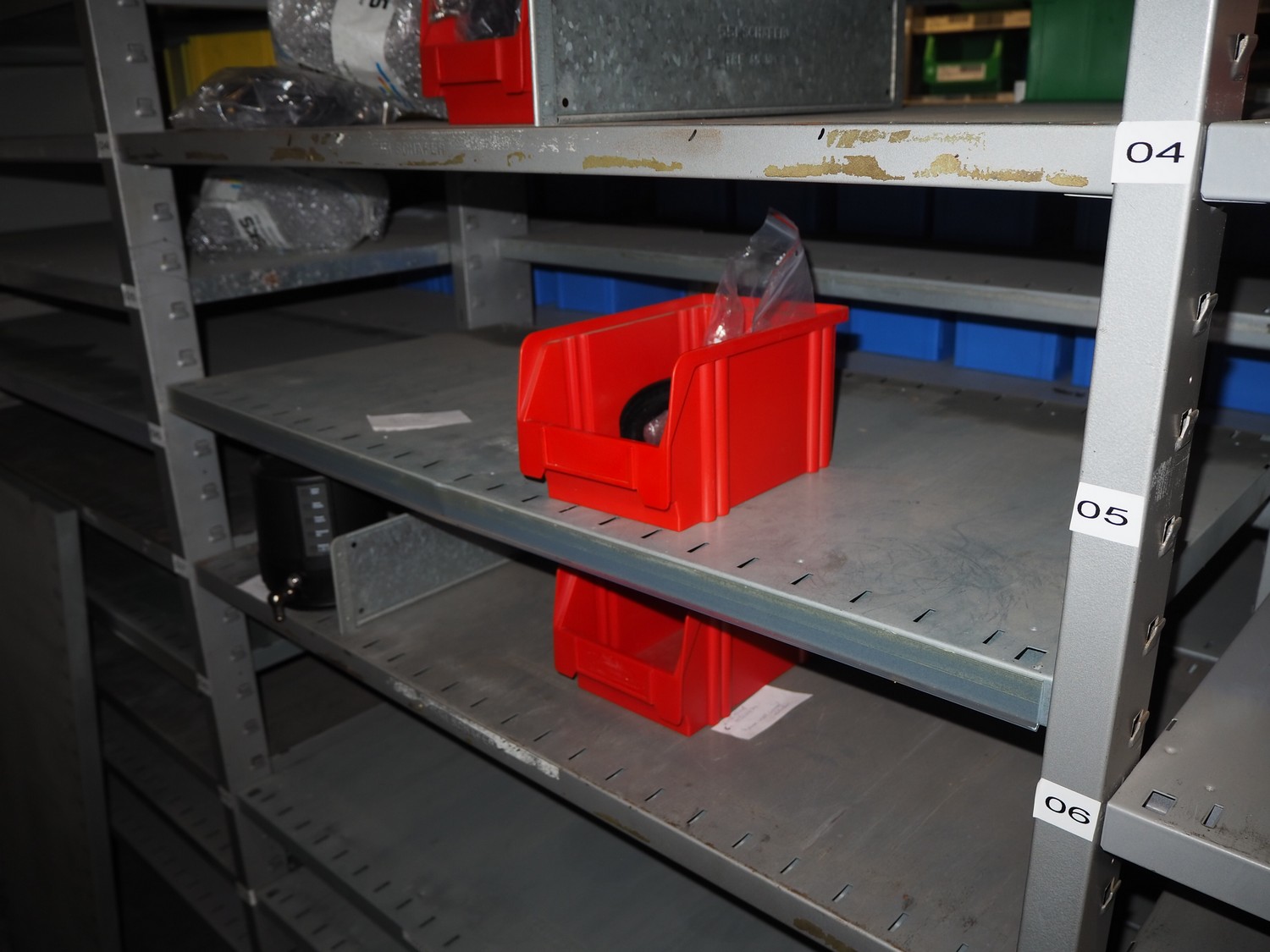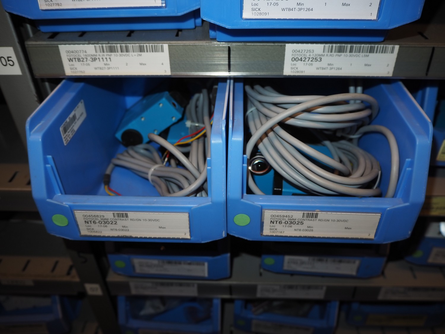 Steel racks with large amount of electrical parts, sensors, brands among others, dimensions: 7250 mm x 1000 mm x 2170 mm.