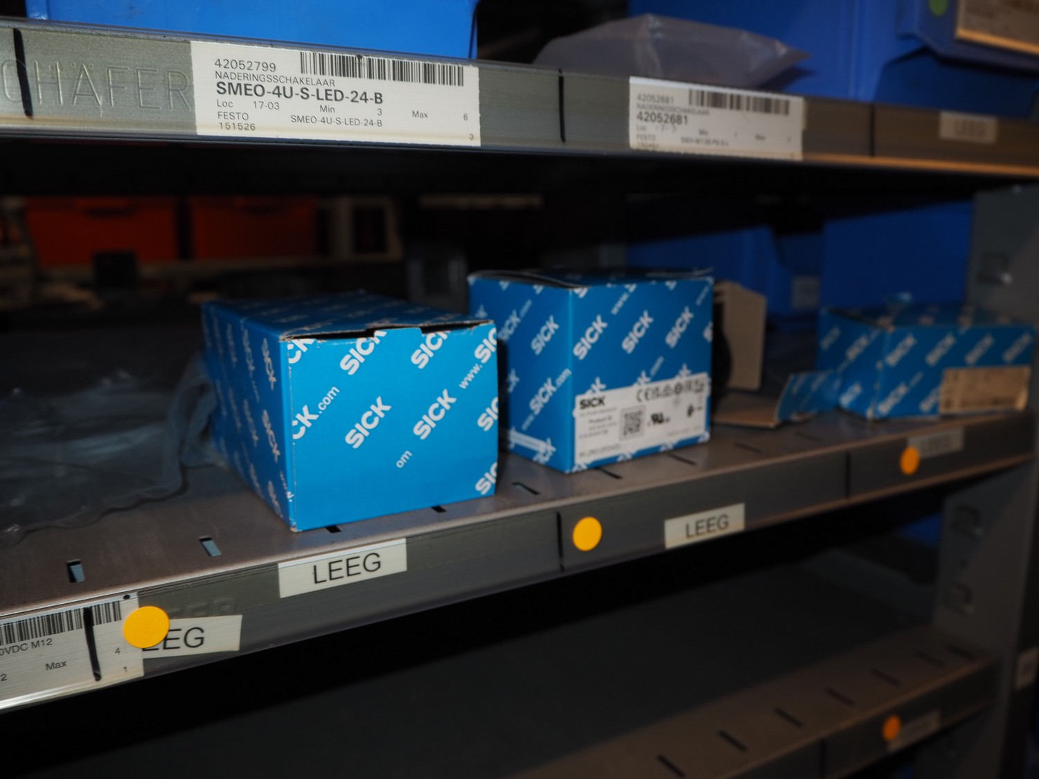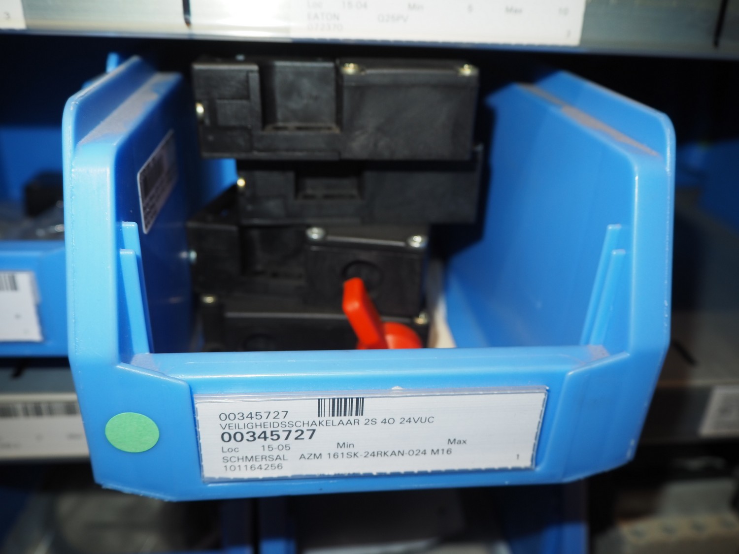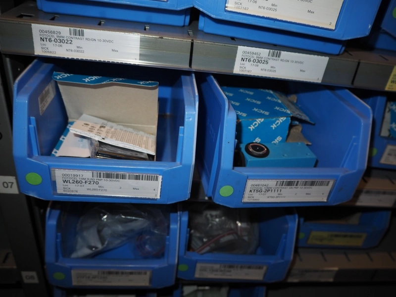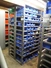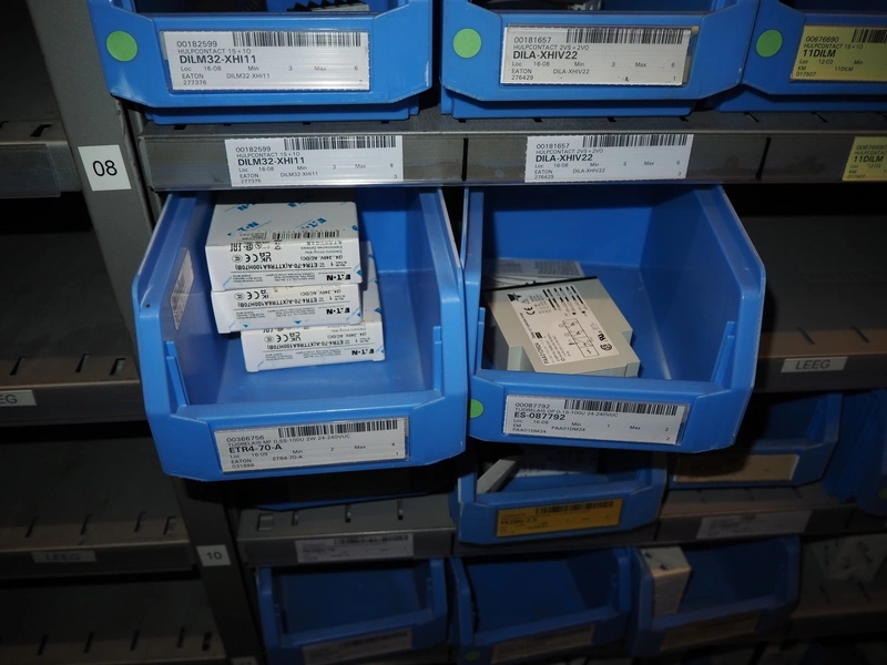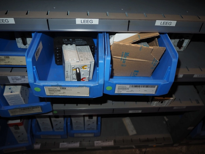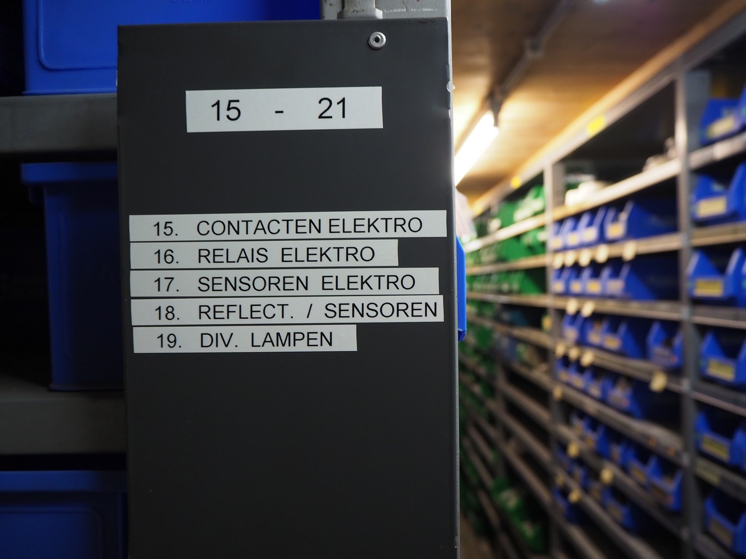 Steel racks with large amount of electrical parts, sensors, brands among others, dimensions: 7250 mm x 1000 mm x 2170 mm.