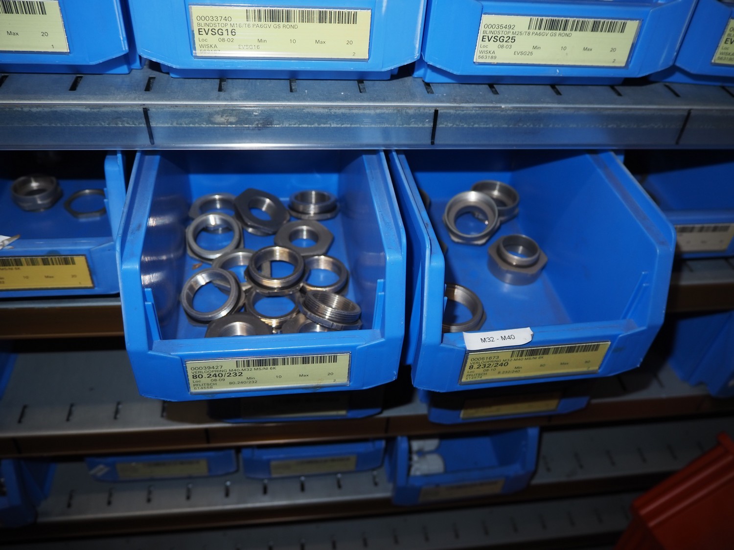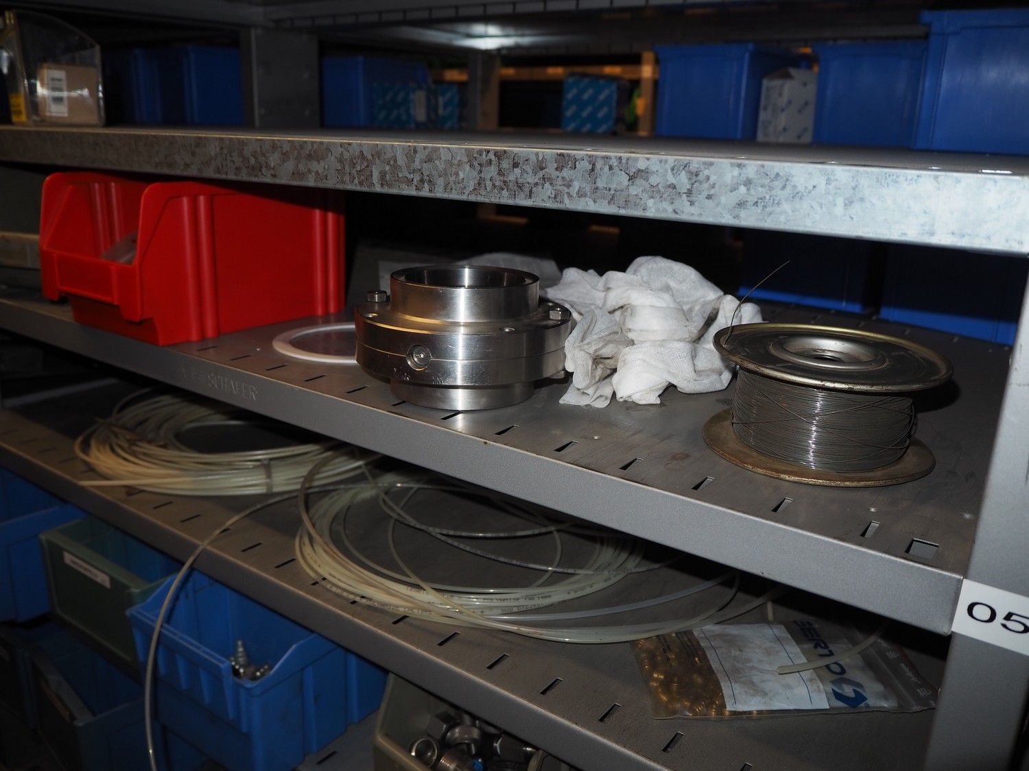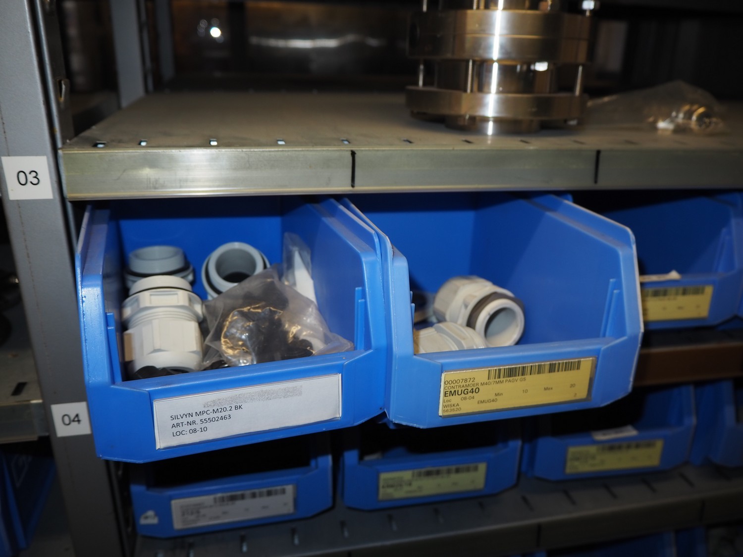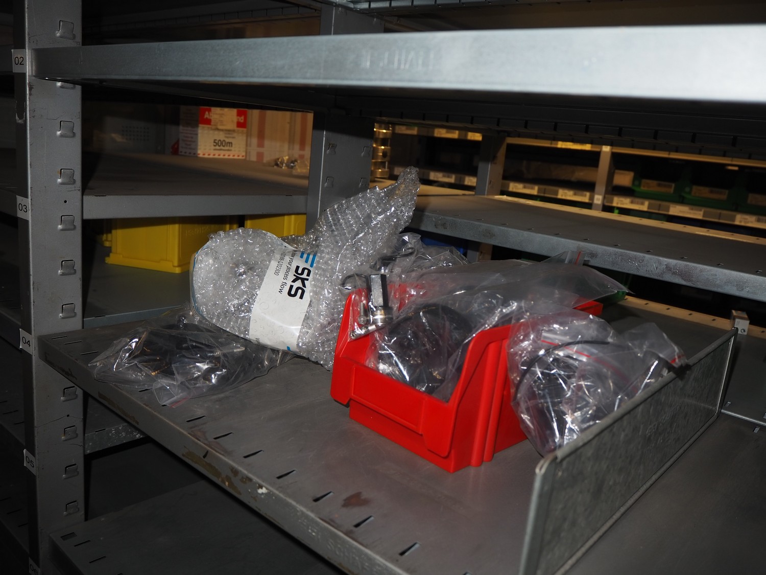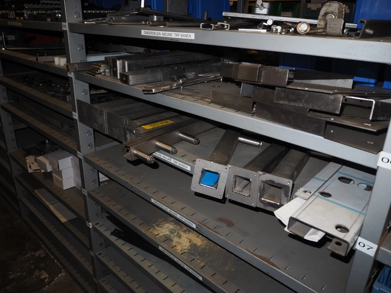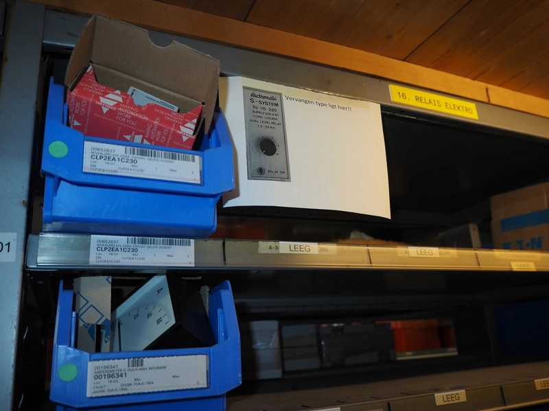 Steel racks with large amount of electrical parts, sensors, brands among others, dimensions: 7250 mm x 1000 mm x 2170 mm.