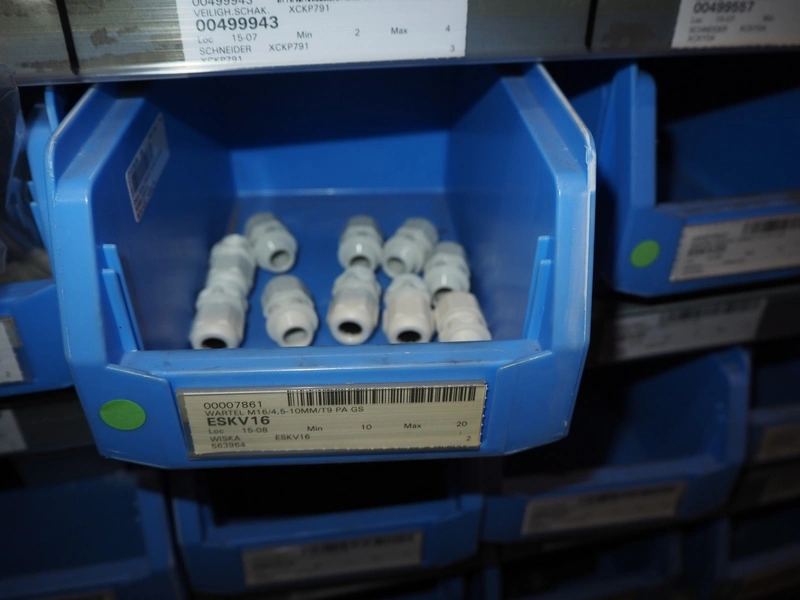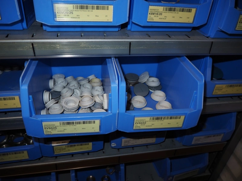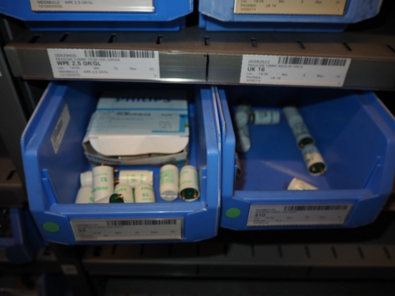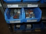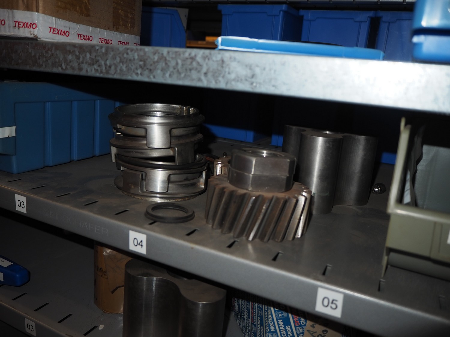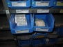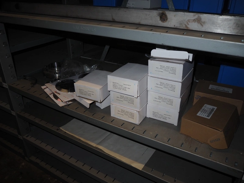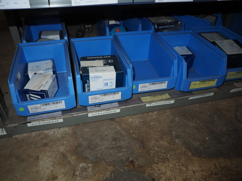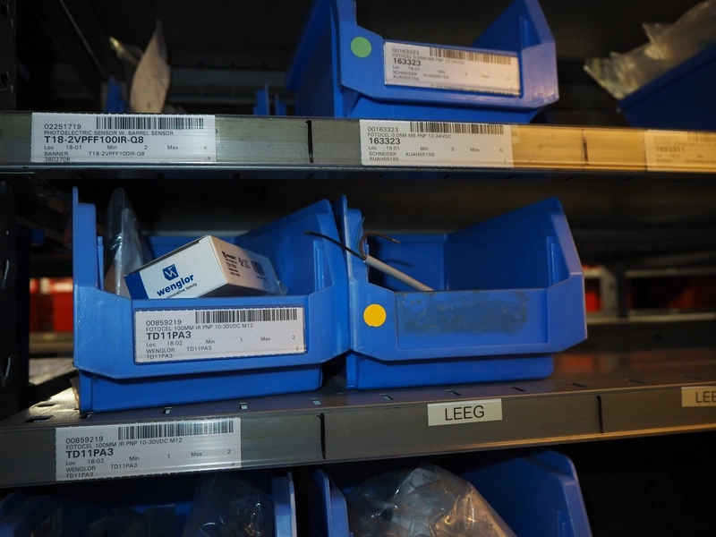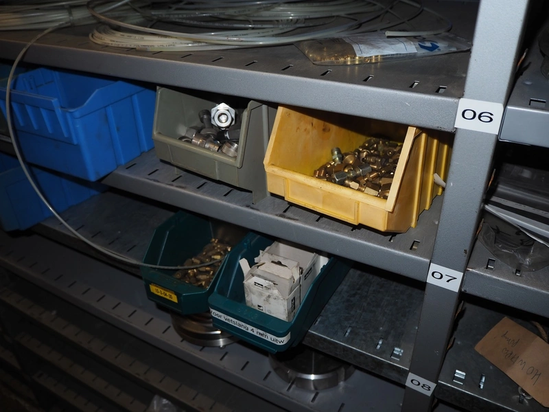 Steel racks with large amount of electrical parts, sensors, brands among others, dimensions: 7250 mm x 1000 mm x 2170 mm.