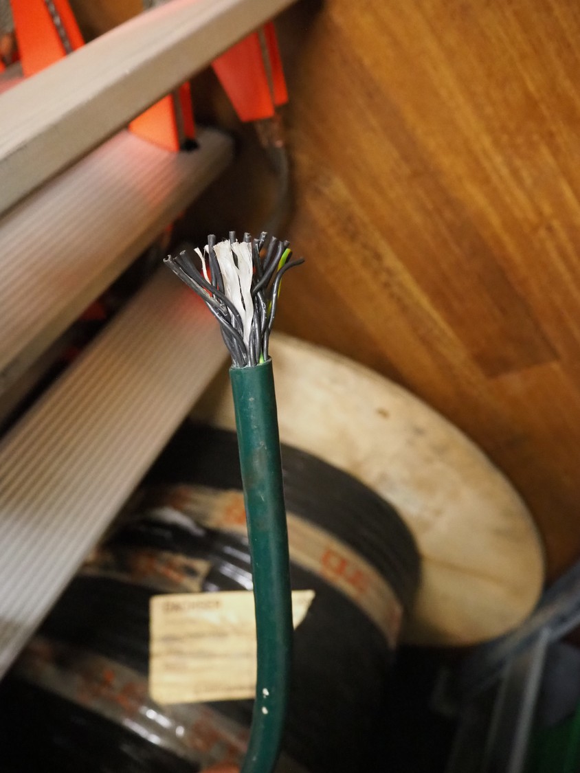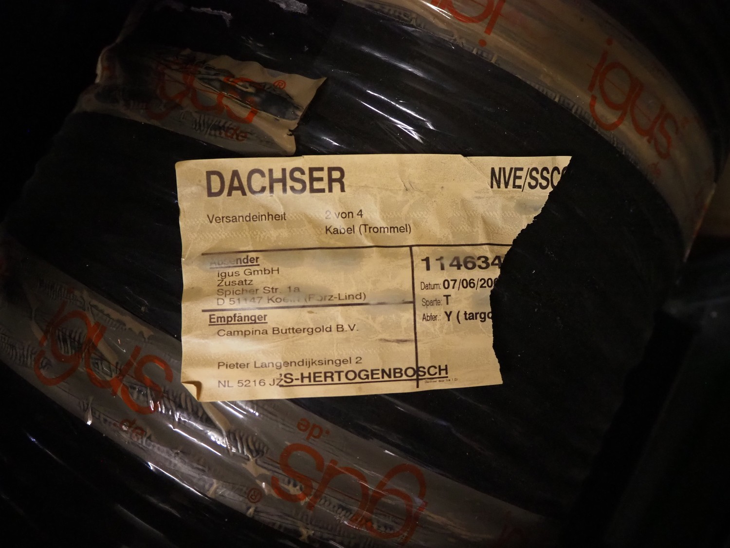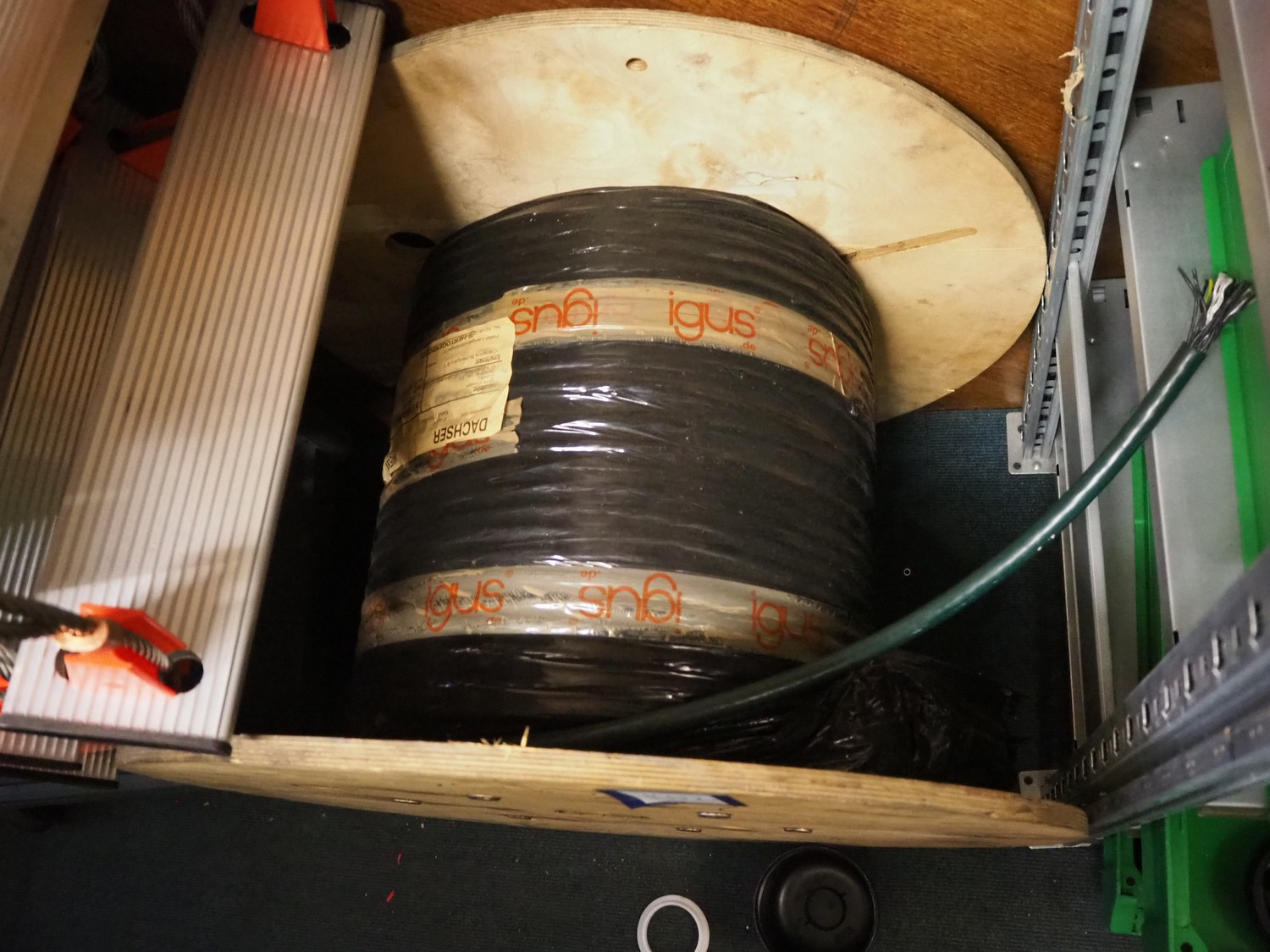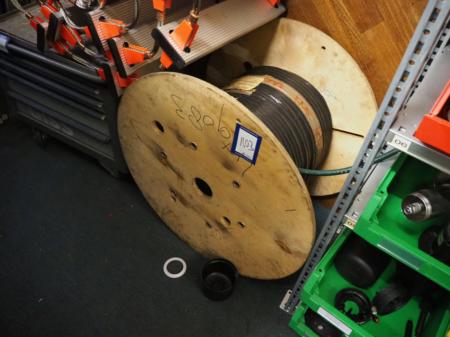 Wooden reel with electrical cable, dimensions: Ø 750 mm x 550 mm.
