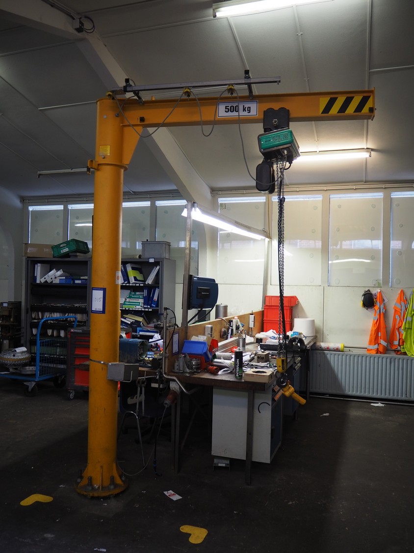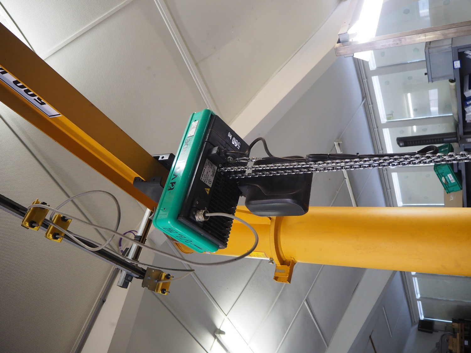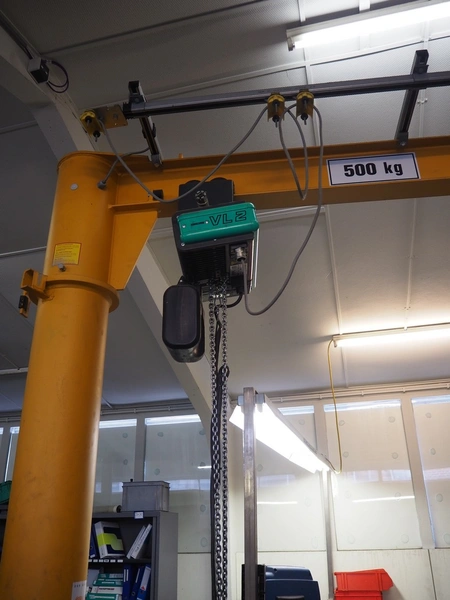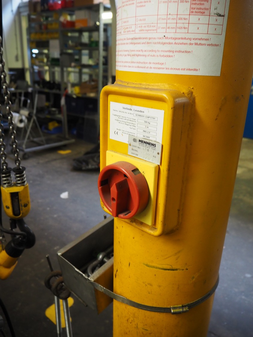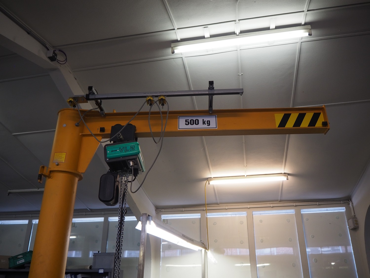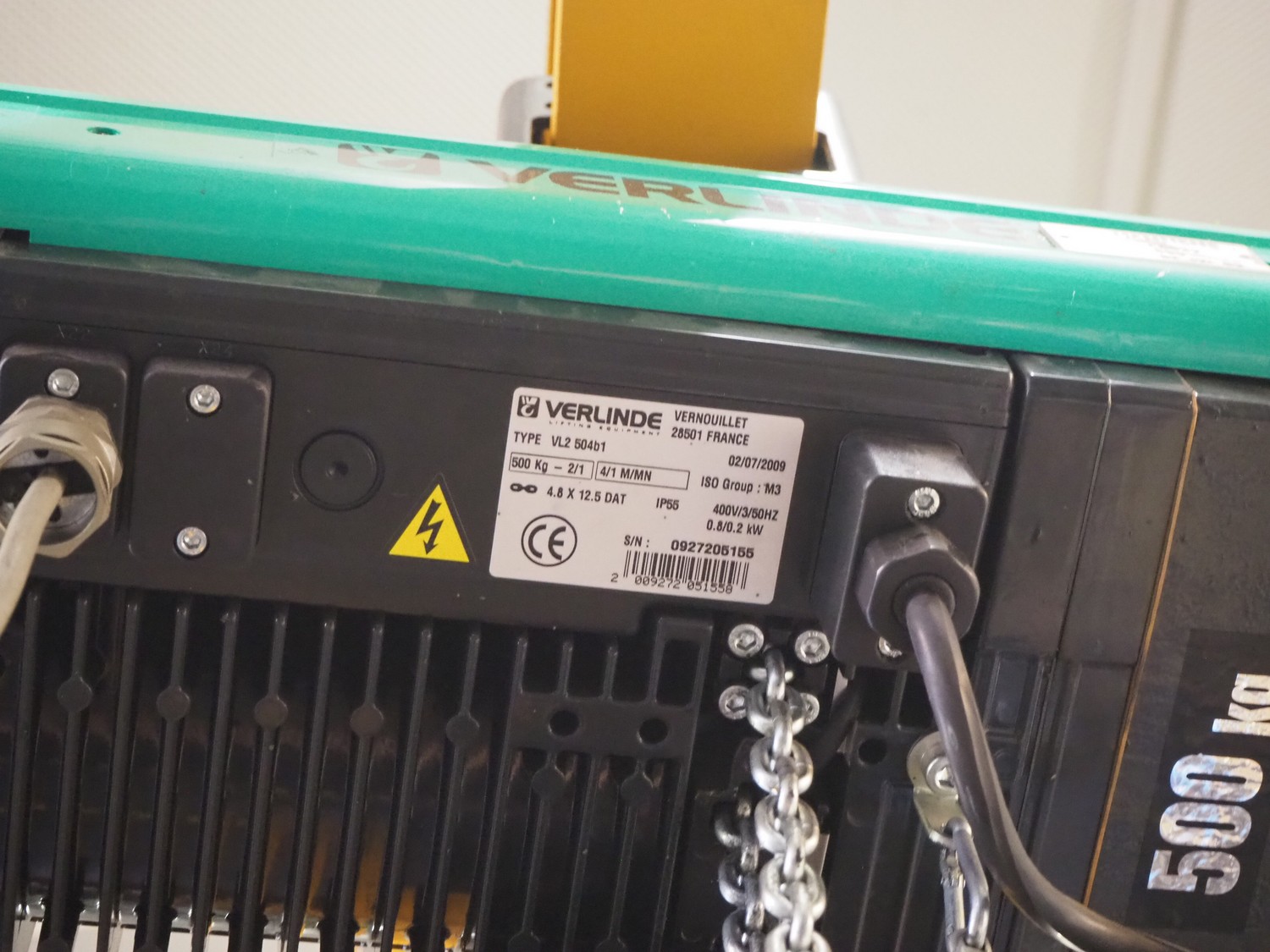 Verlinde steel beam with chain hoist, beam type: PR5-2.0, serial number: 921889/01--CHP17791, year of construction: 06/2009, capacity: 500 kg, Verlinde hoist type: VL2 504b1, serial number: 0927205155, year of construction: 02/07/2009, 400 V, 3 Ph, 50 Hz, 0.8/0.2 kW, capacity: 500 kg, dimensions: 2200 mm x 500 mm x 3150 mm.