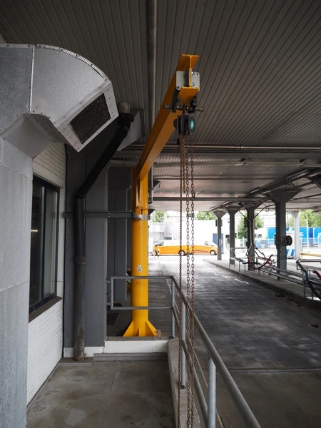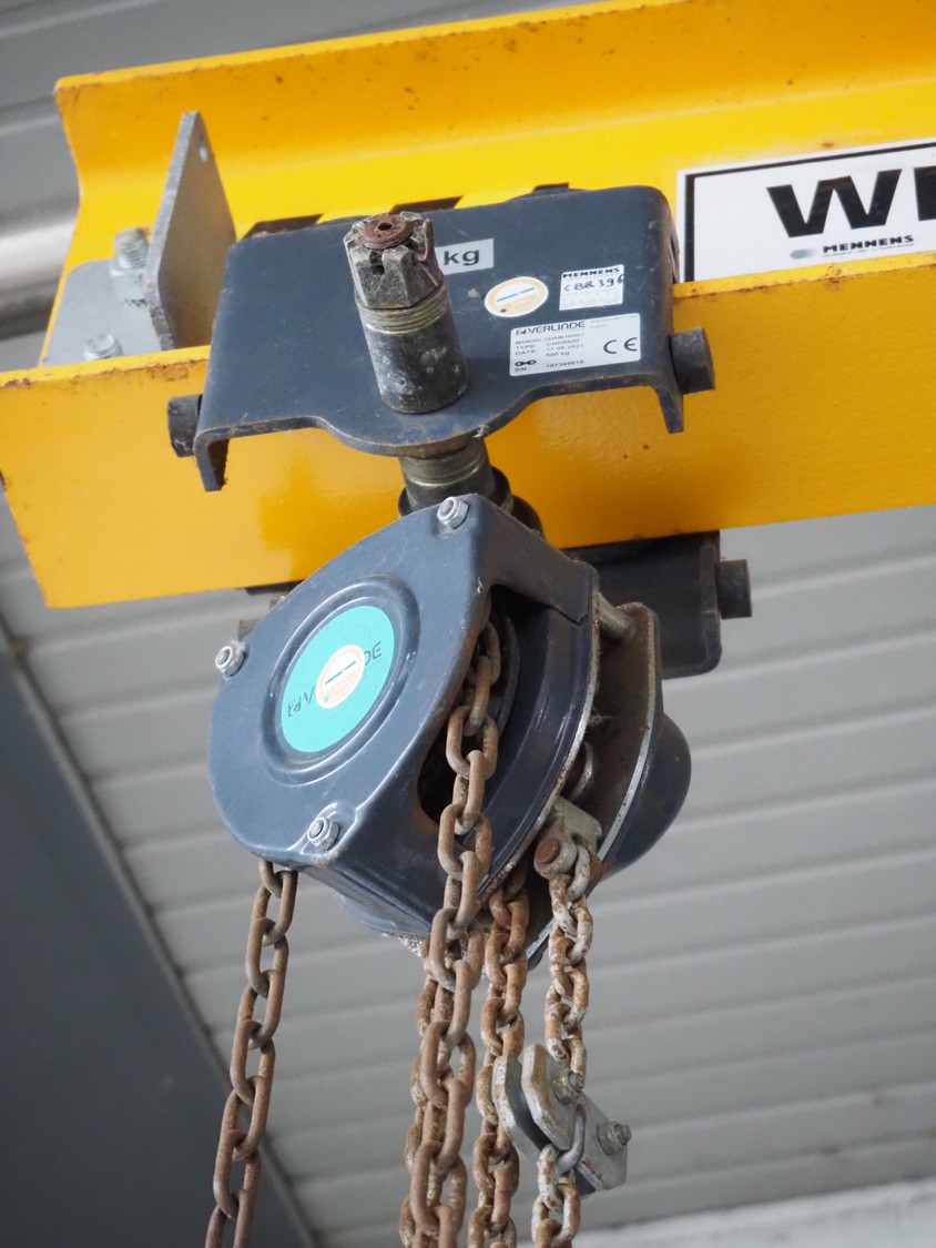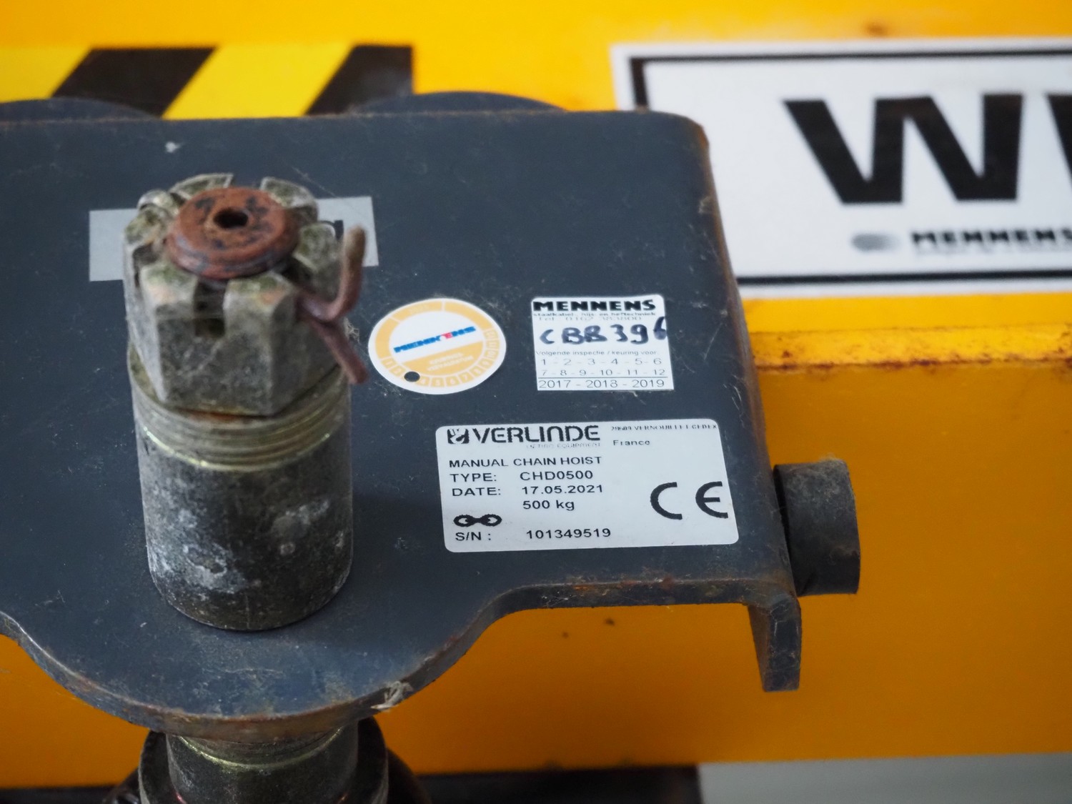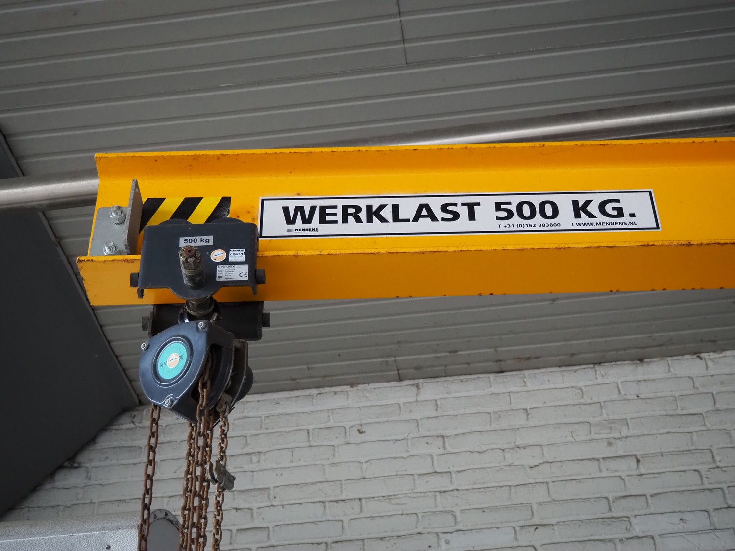 Comege steel lifting arm, serial number: 211824, year of construction: 2021, with Verlinde manual chain hoist, type: CHD0500, serial number: 101349519, year of construction: 17.05.2021, max capacity: 500 kg, total dimensions: 4800 mm x 850 mm x 3200 mm.