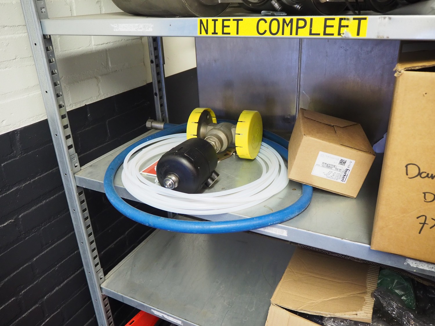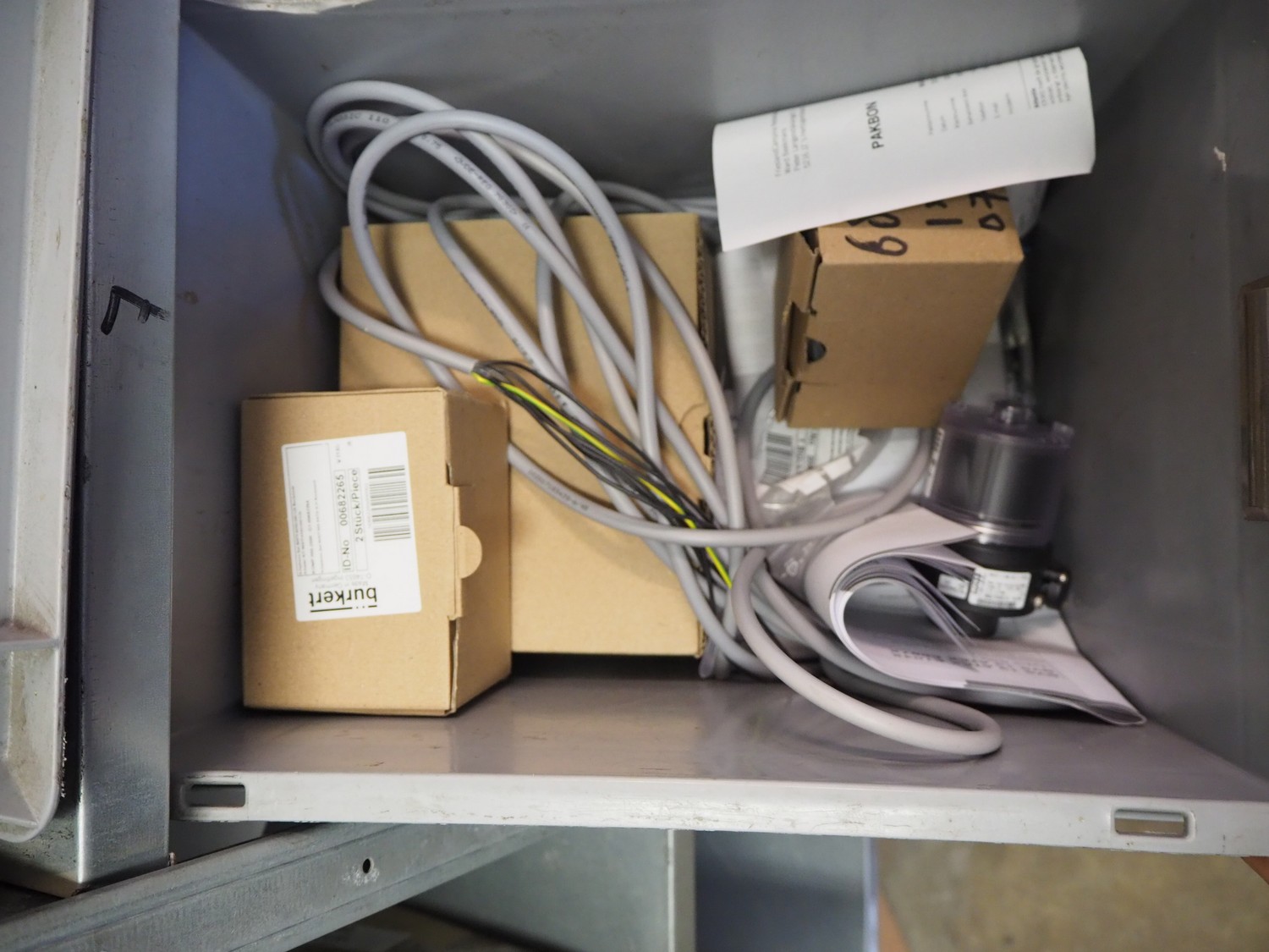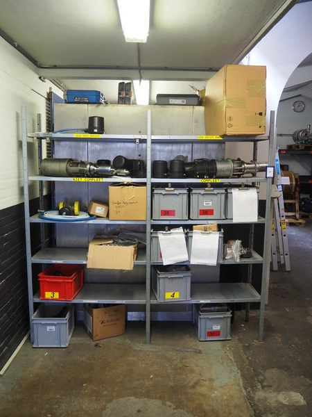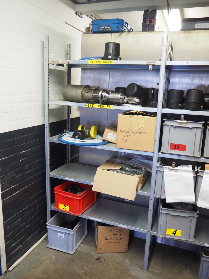 Steel rack with various valves and parts, 10 floors, floor dimensions: 980 mm x 400 mmm, total dimensions: 2080 mm x 400 mm x 2000 mm.