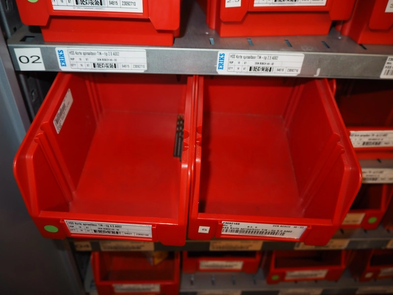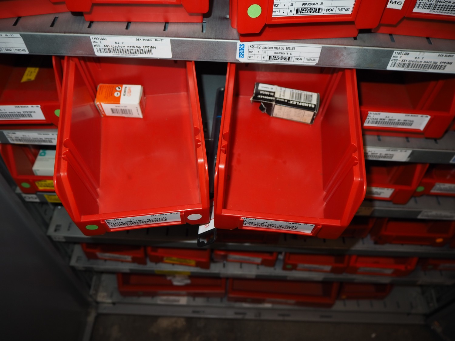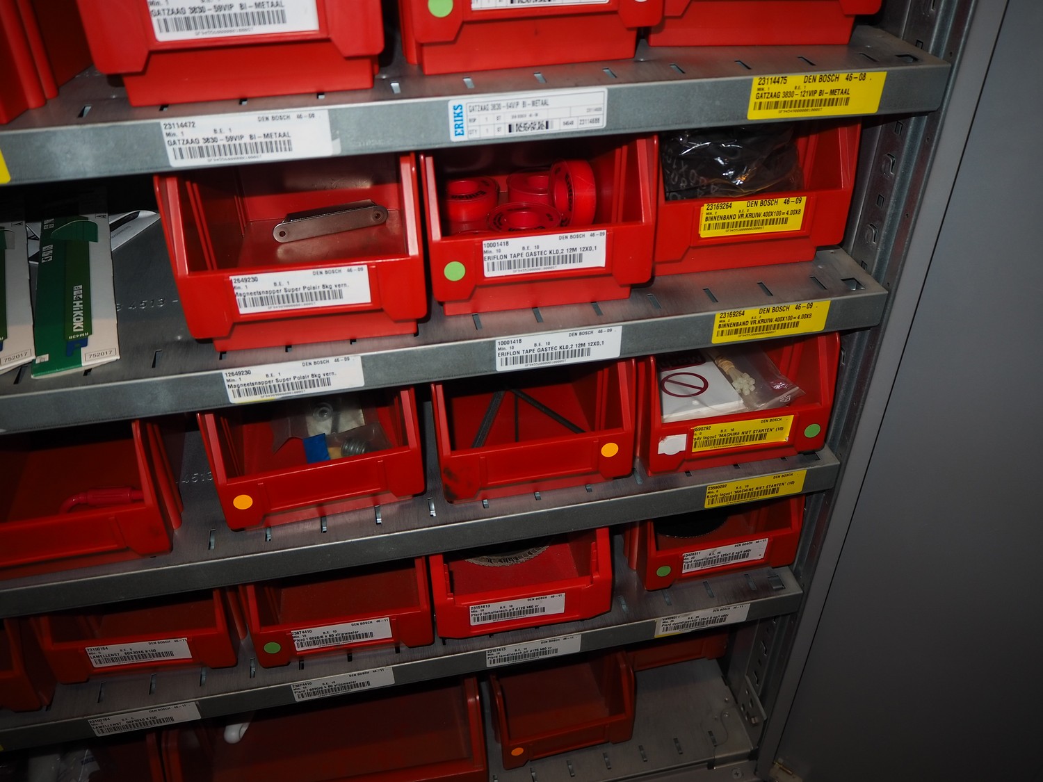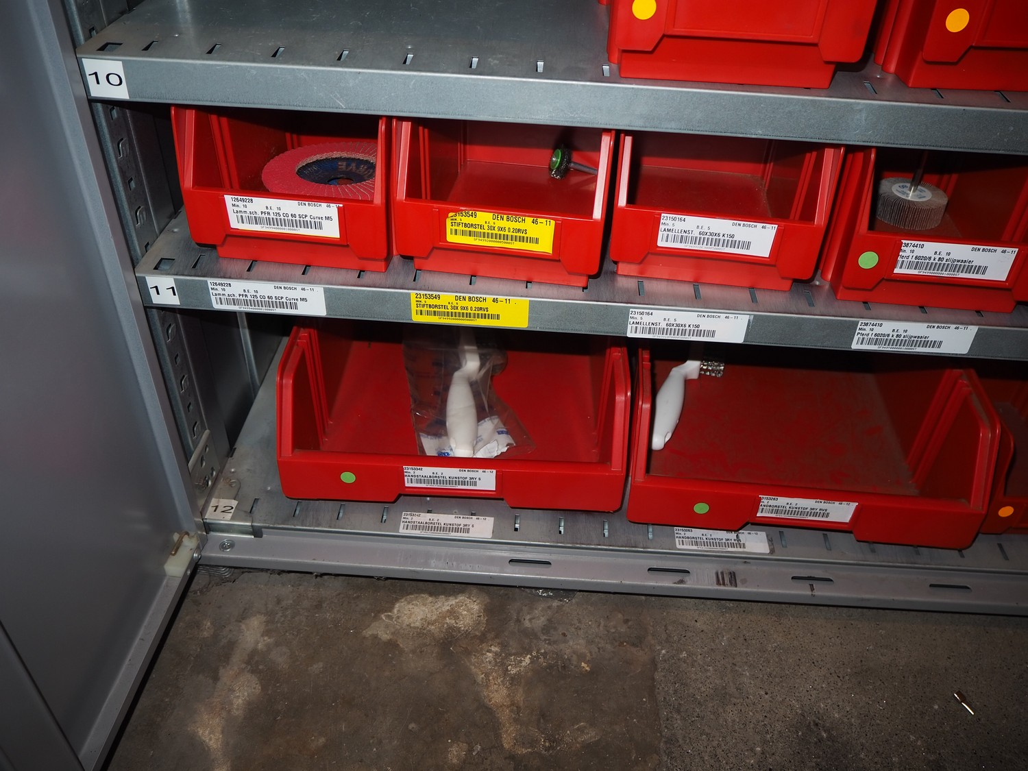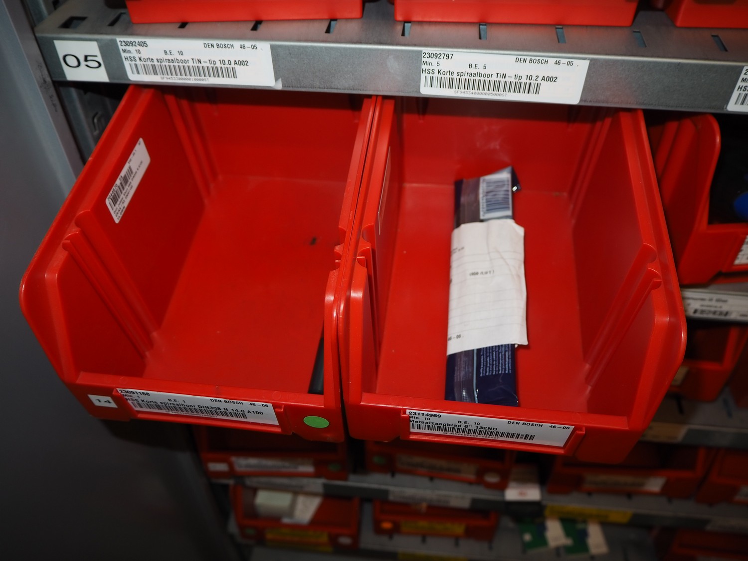Steel cabinet with drills, taps, bearings and other tools, dimensions: 1020 mm x 500 mm x 2200 mm.