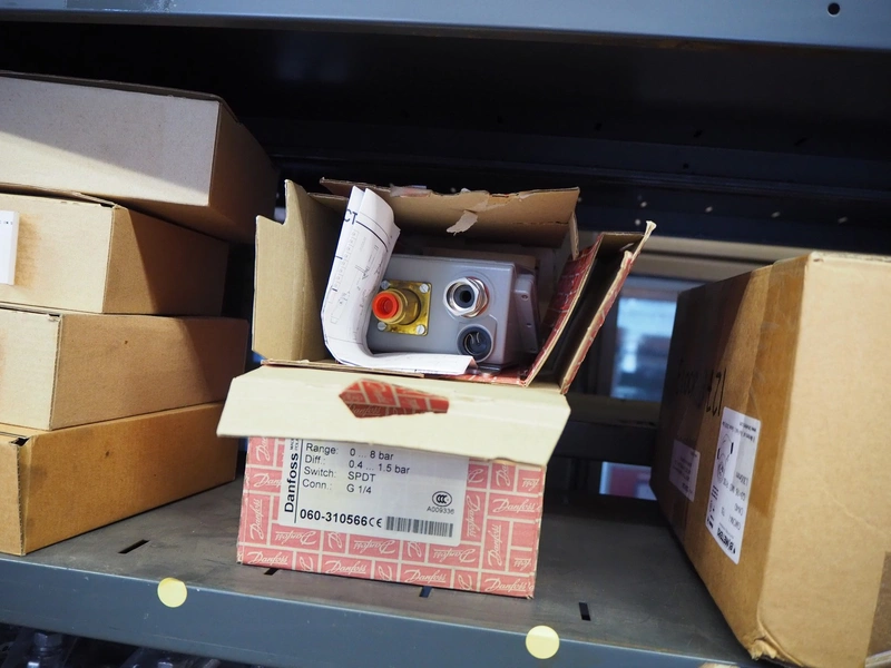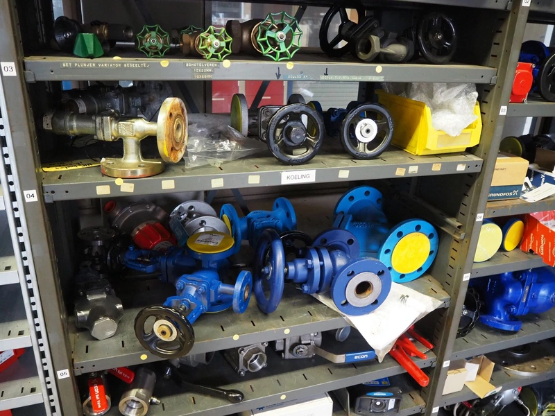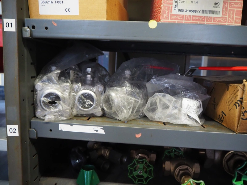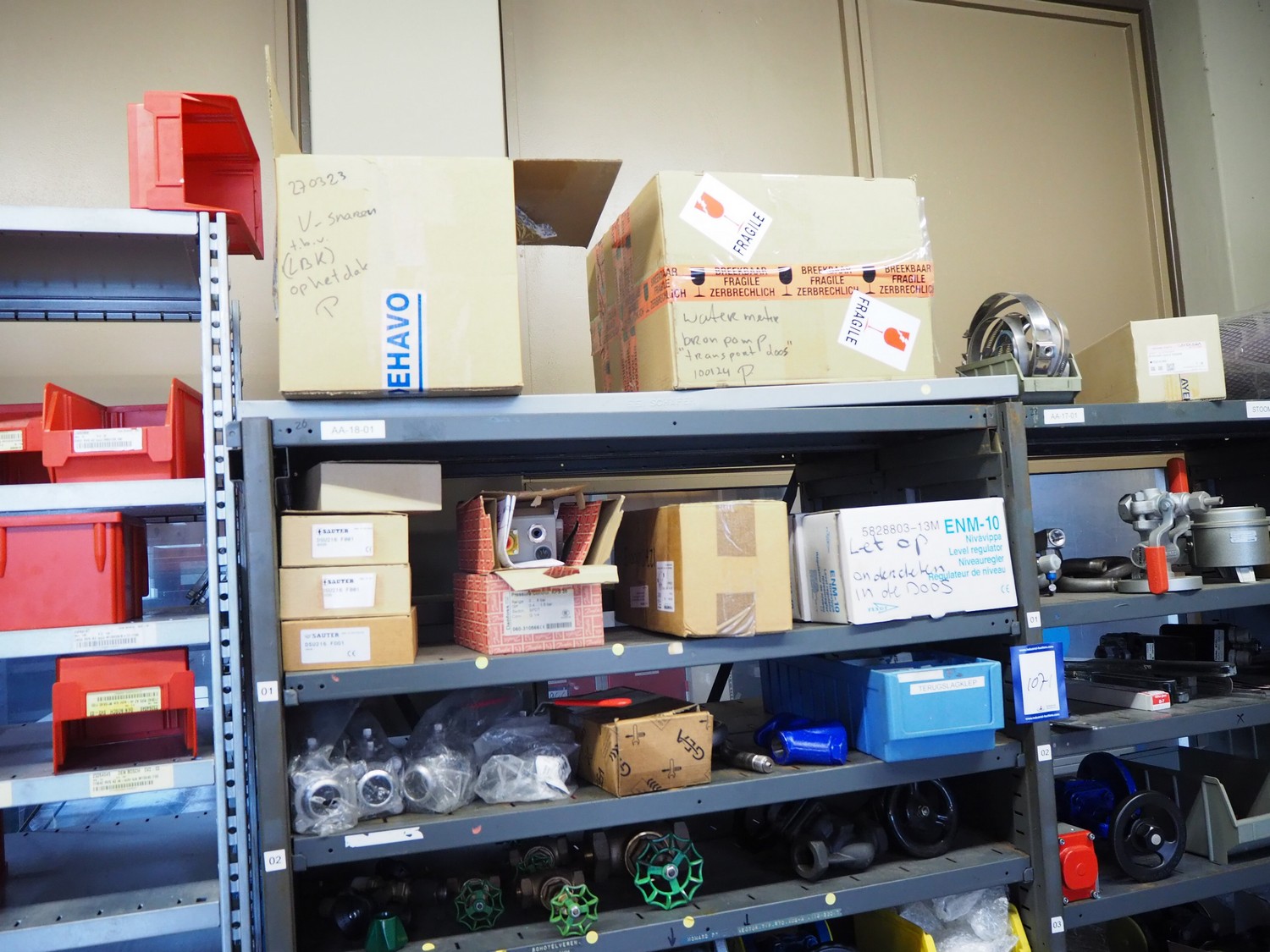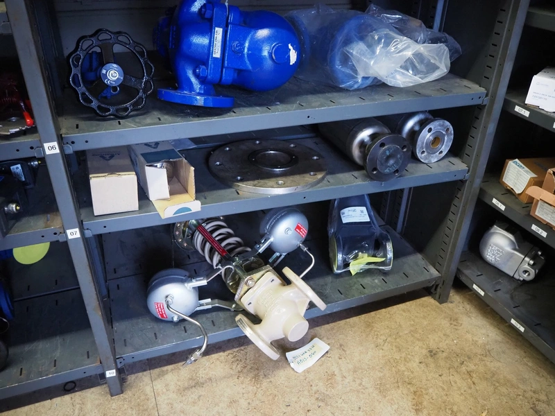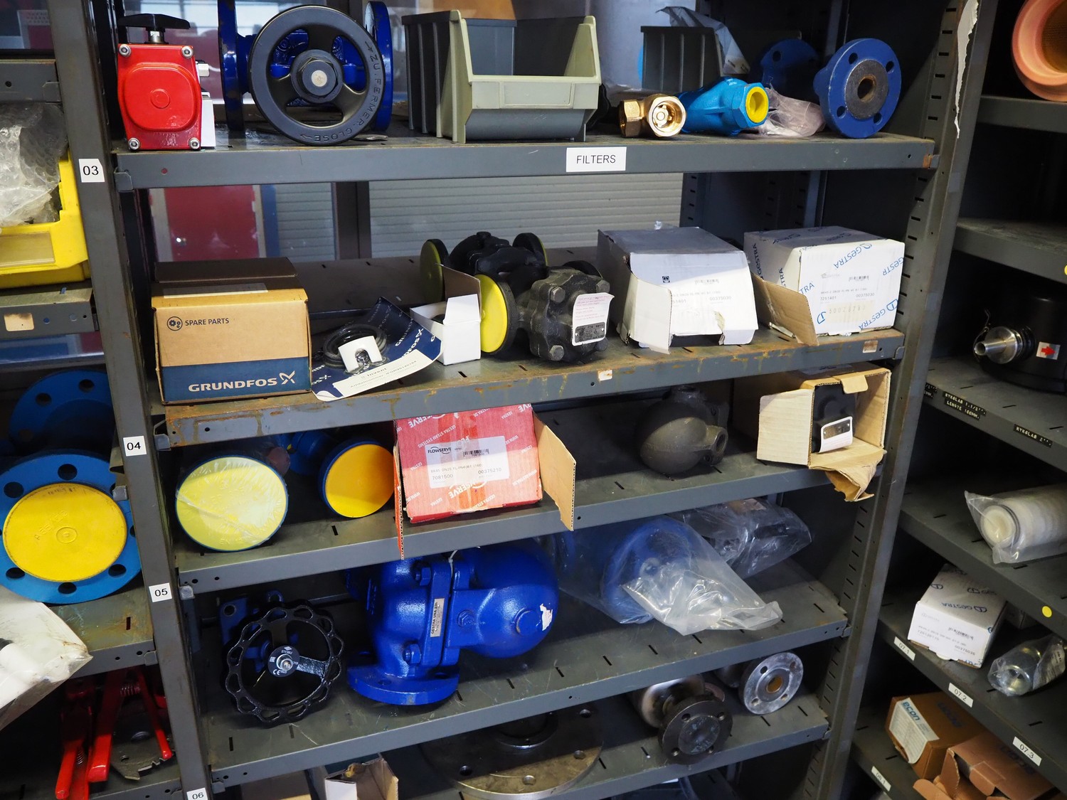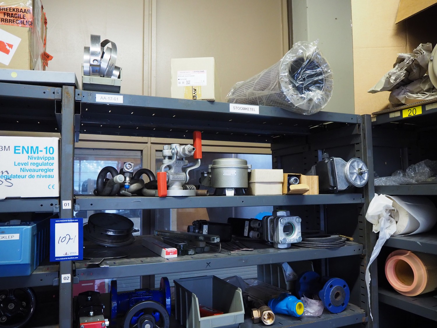 Steel rack with various parts for steam boiler, among others: valves, filters, tec, dimensions rack: 1950 mm x 600 mm x 2020 mm.