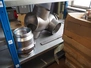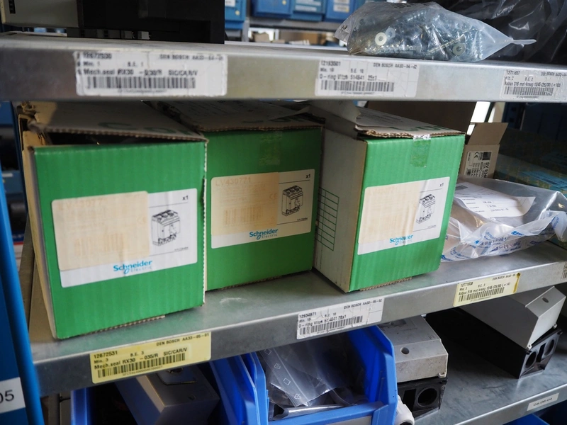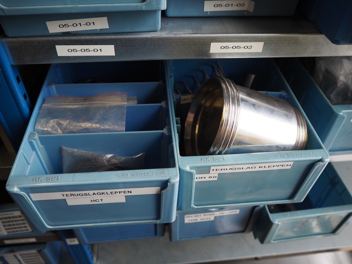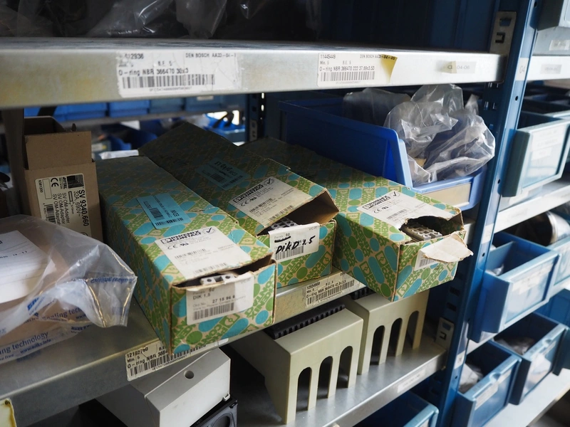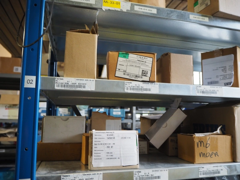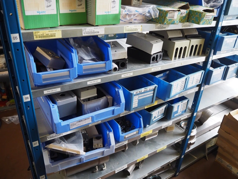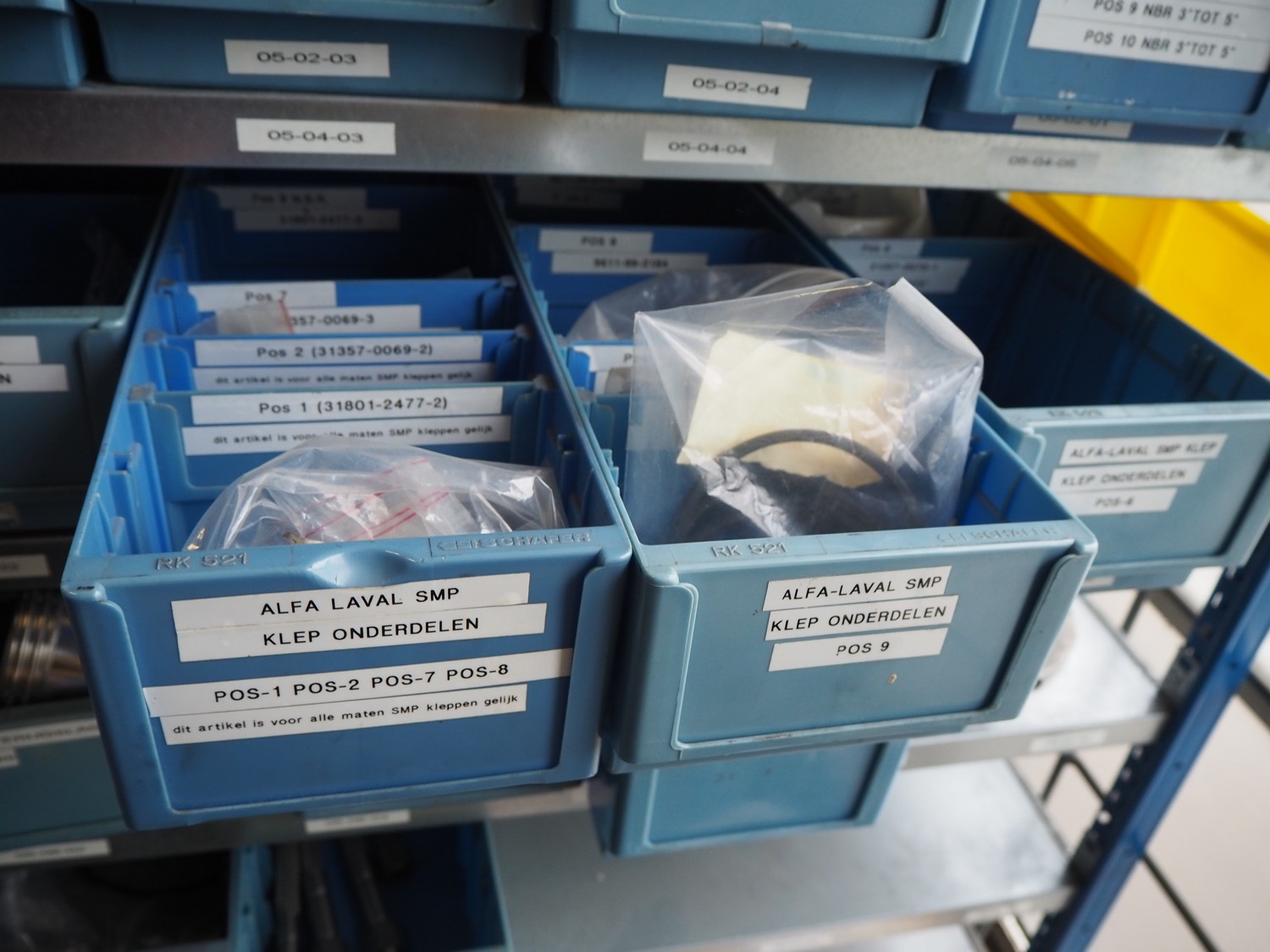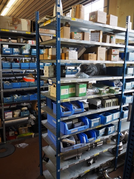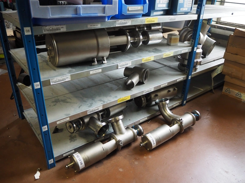 Steel rack with various Alfa Laval valves and spare parts for Alfa Laval valves, dimensions: 2050 mm x 500 mm x 2200 mm.