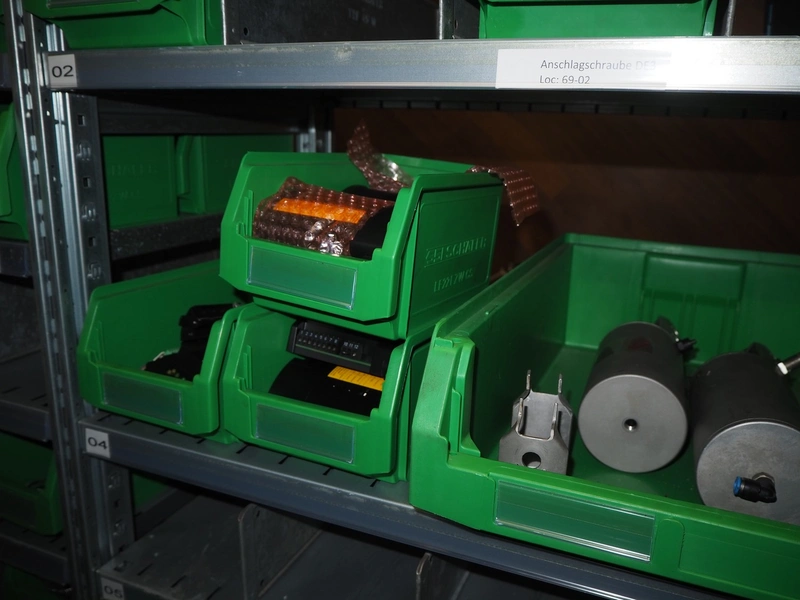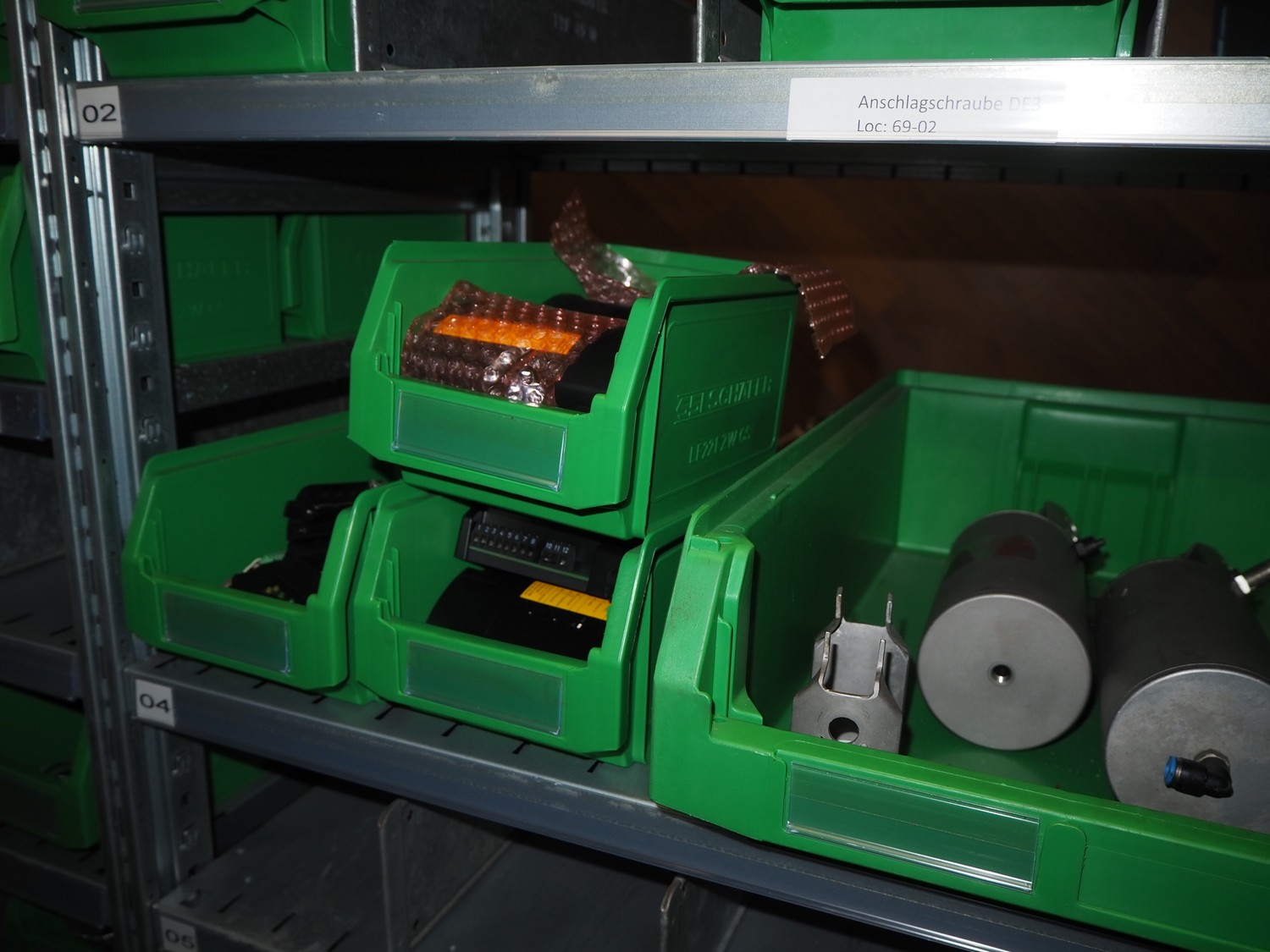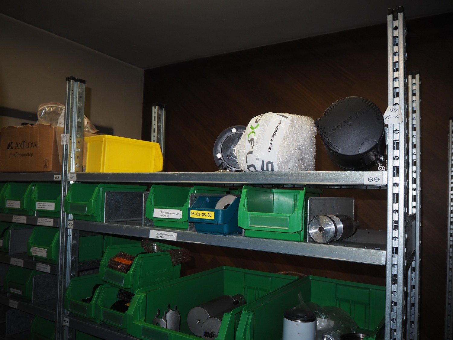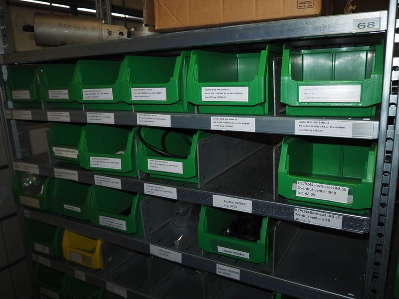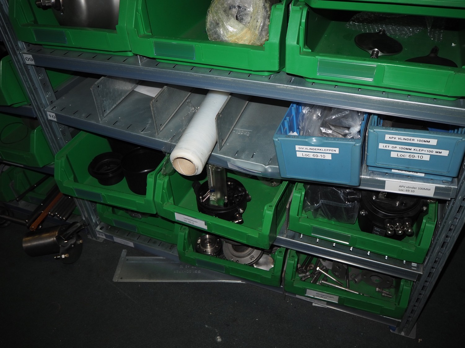 2 steel racks with various spare parts for valves, dimensions: (2x) 1060 mm x 500 mm x 2300 mm.