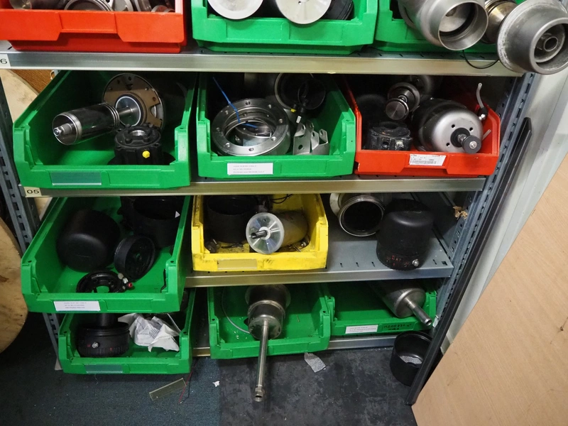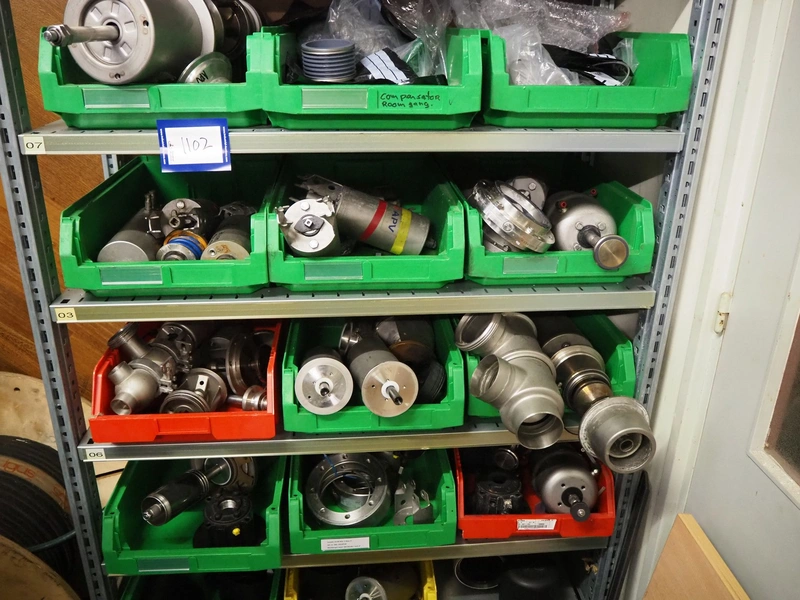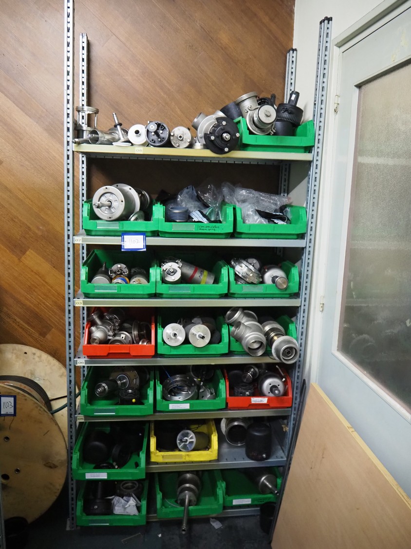 Steel rack with various spare parts for valves, dimensions: 1060 mm x 500 mm x 2300 mm.