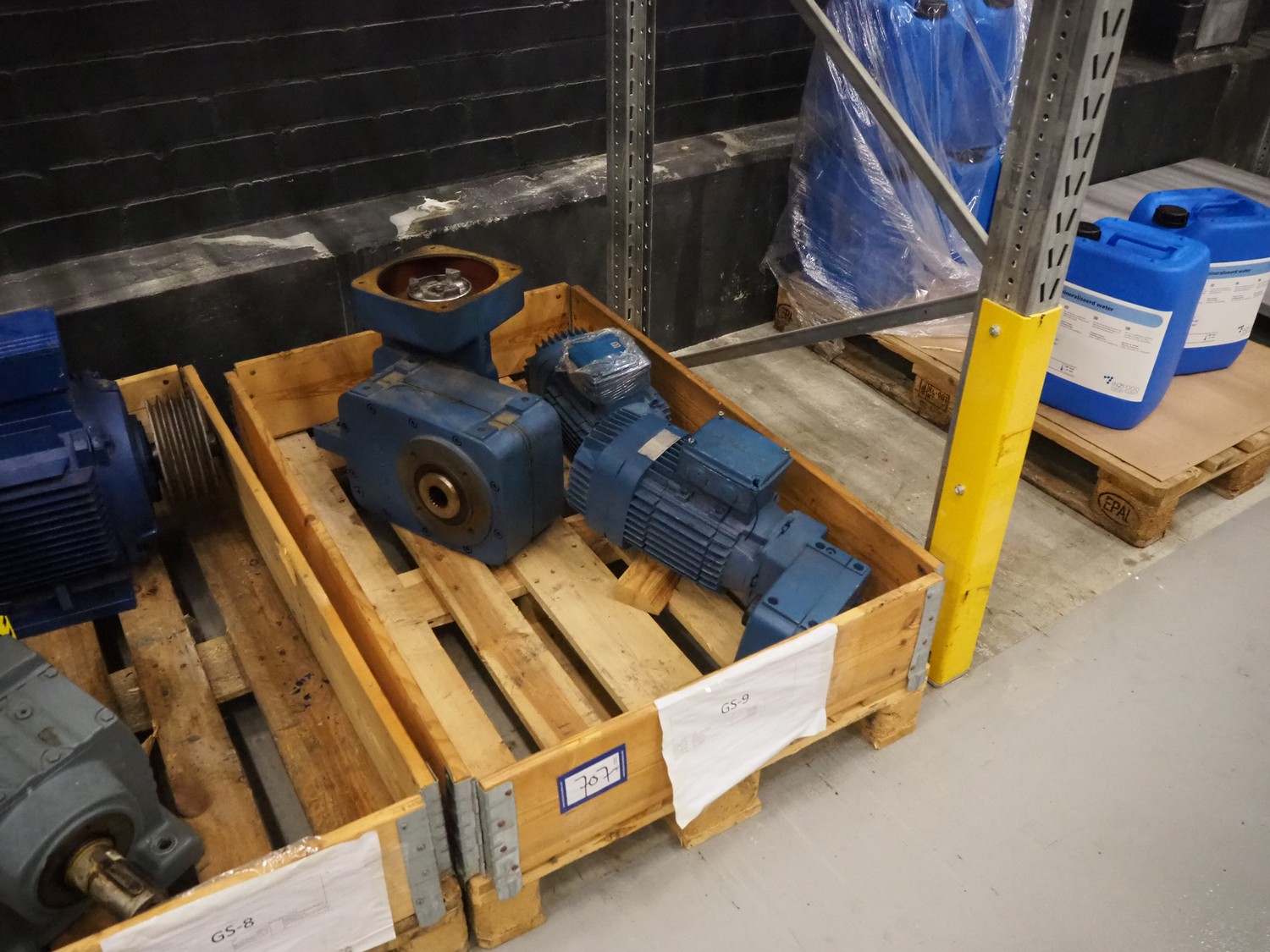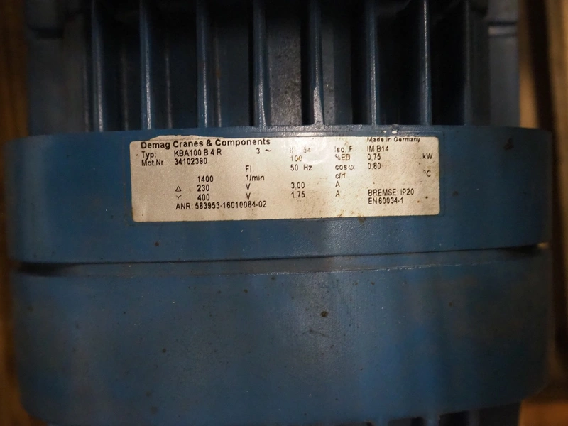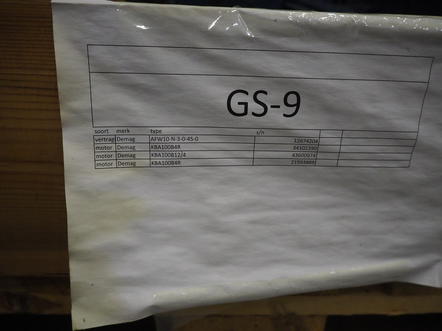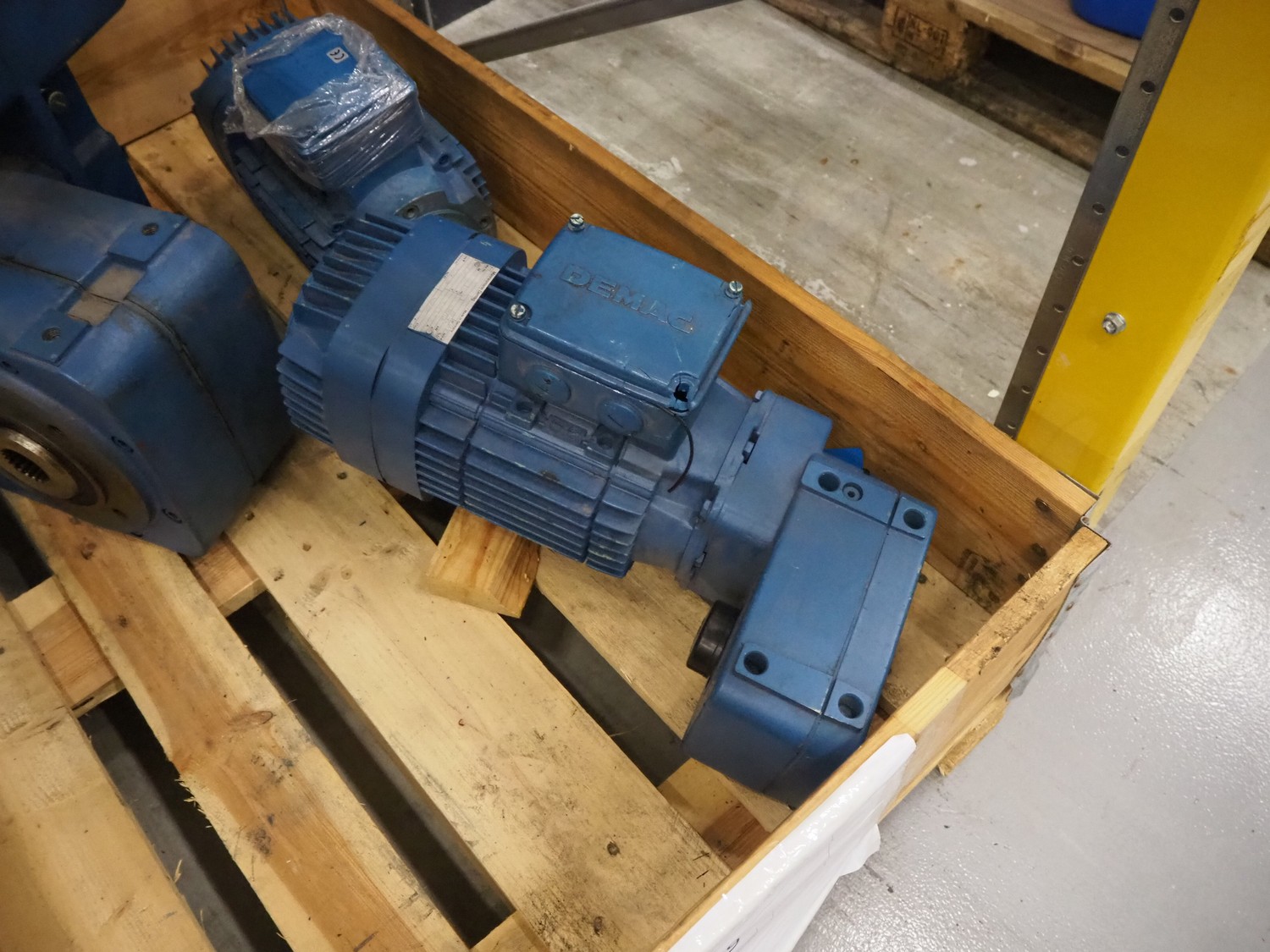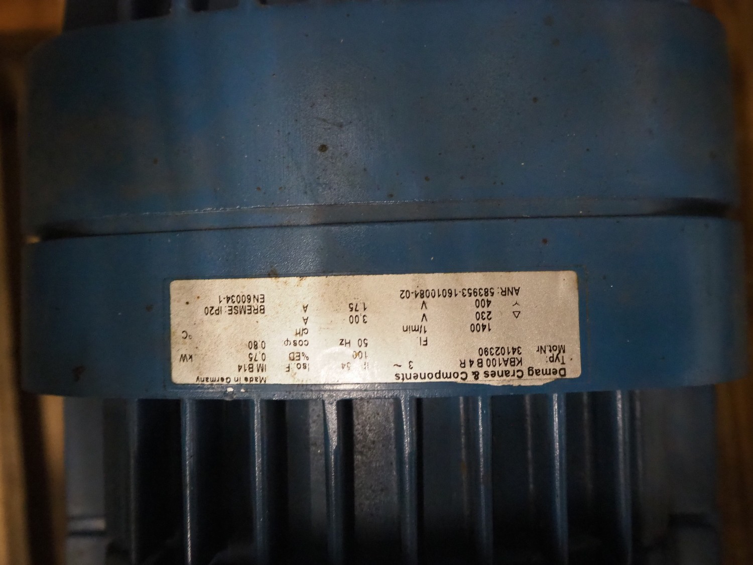 Pallet with 2 Demag motors and 2 gearboxes, type motors: (1x) KBA100B 4 R, 230/400 V, 3 Ph, 50 Hz, 3/1.75 A, 0.75 kW, (1x) KBA 100 B 12/4, 380 V, 3 Ph, 50 Hz, 5.5 A, 0.28/1.6 kW.