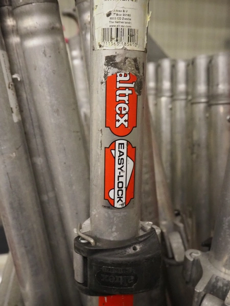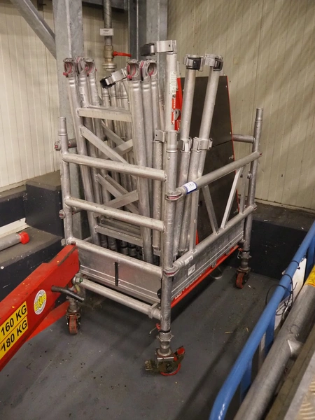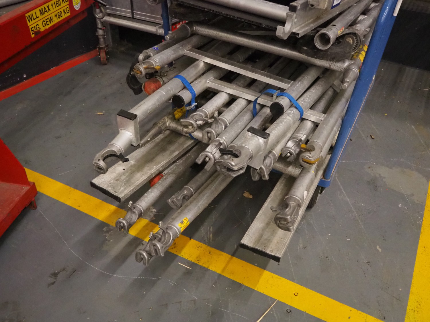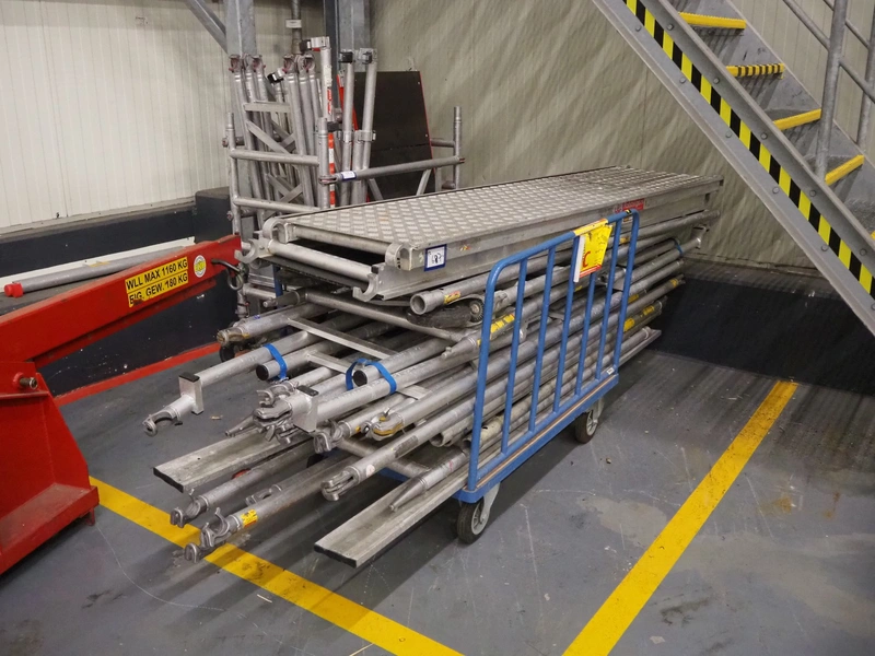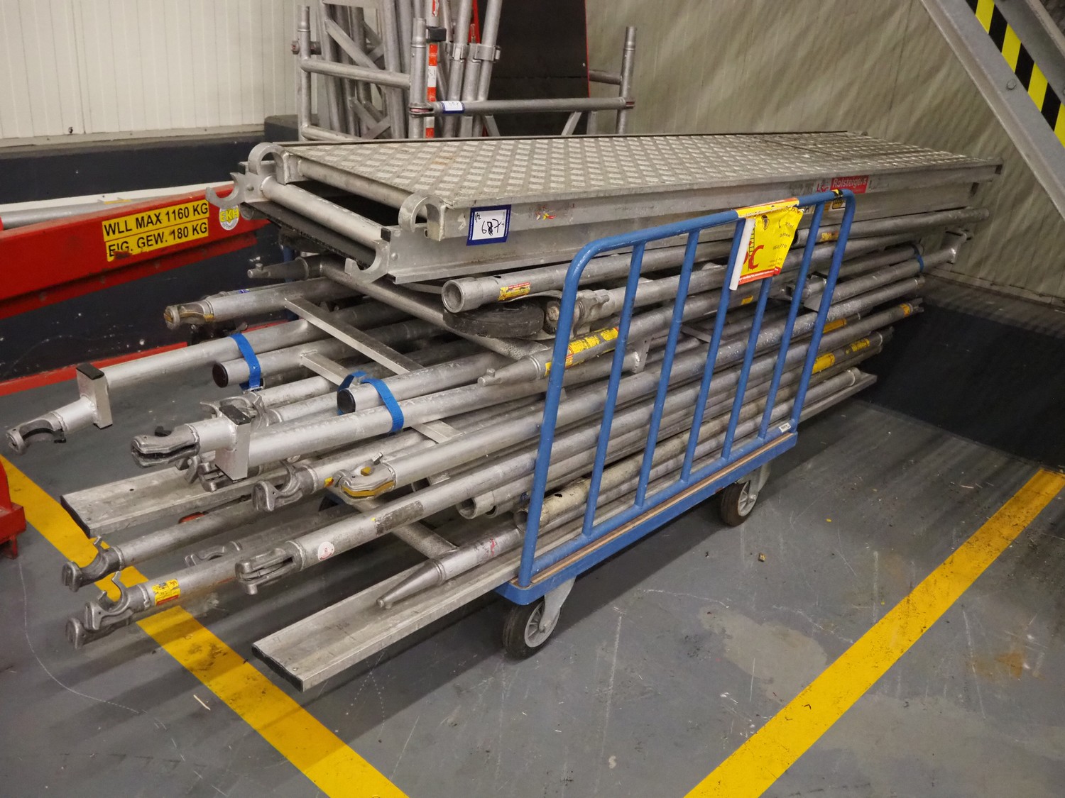 2 steel trolleys with Altrex / Axsto / LCS parts for scaffold, dimensions: 3000 mm x 900 mm x 1100 mm and 1200 mm x 730 mm x 1700 mm.