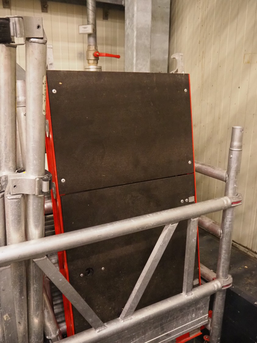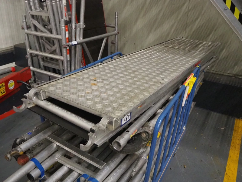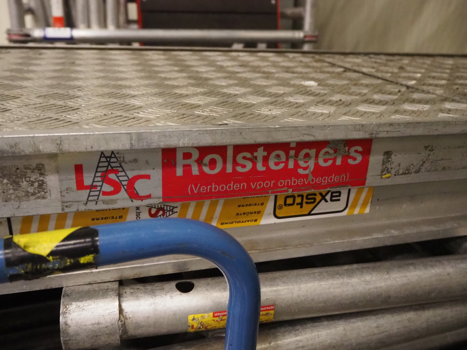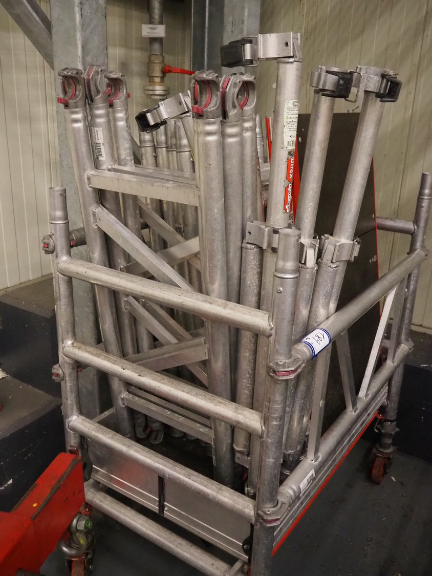 2 steel trolleys with Altrex / Axsto / LCS parts for scaffold, dimensions: 3000 mm x 900 mm x 1100 mm and 1200 mm x 730 mm x 1700 mm.