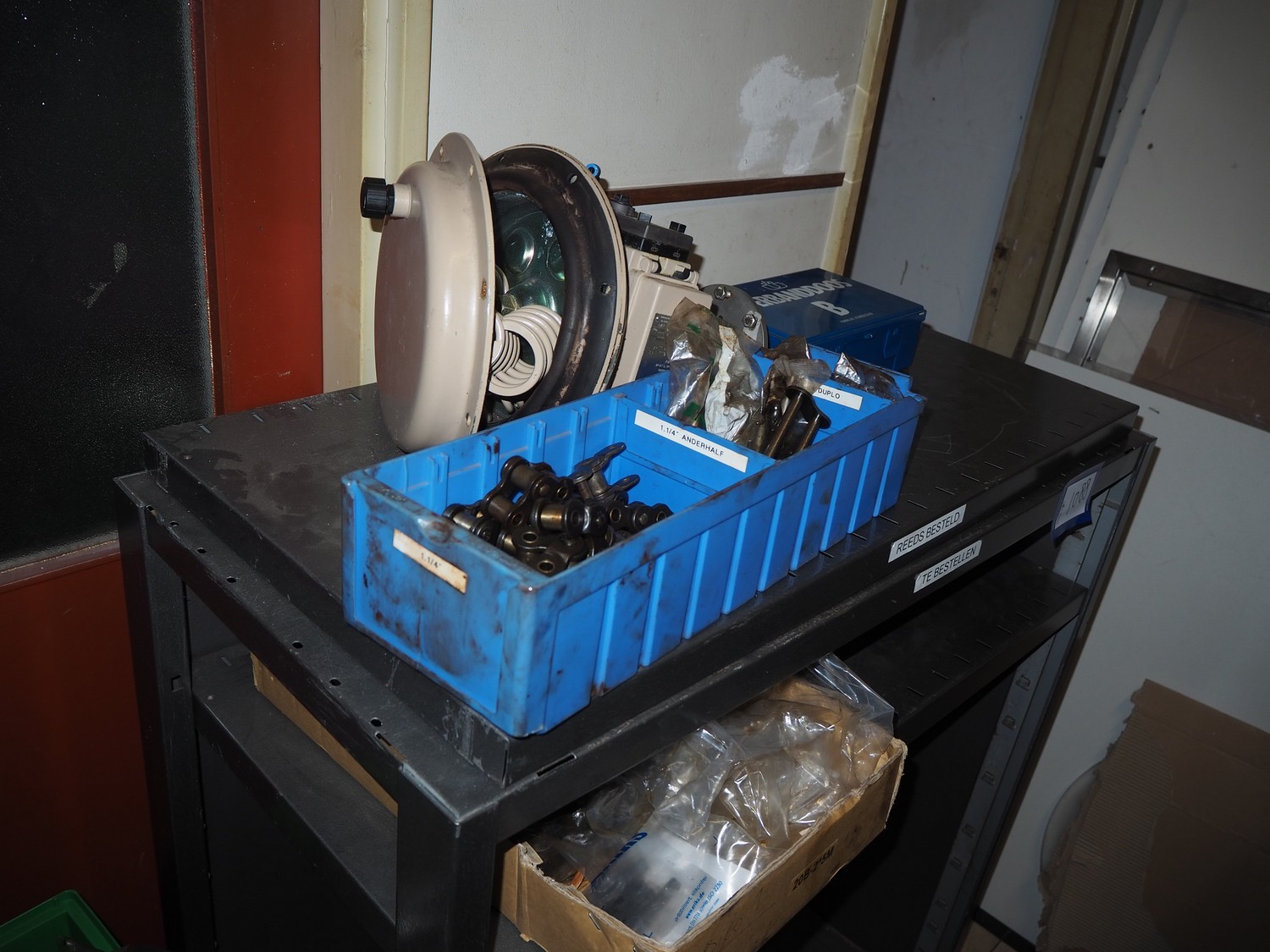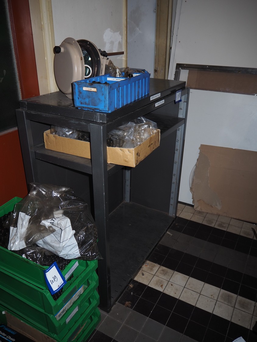 Steel cabinet, dimensions: 1060 mm x 500 mm x 1100 mm. Including content.