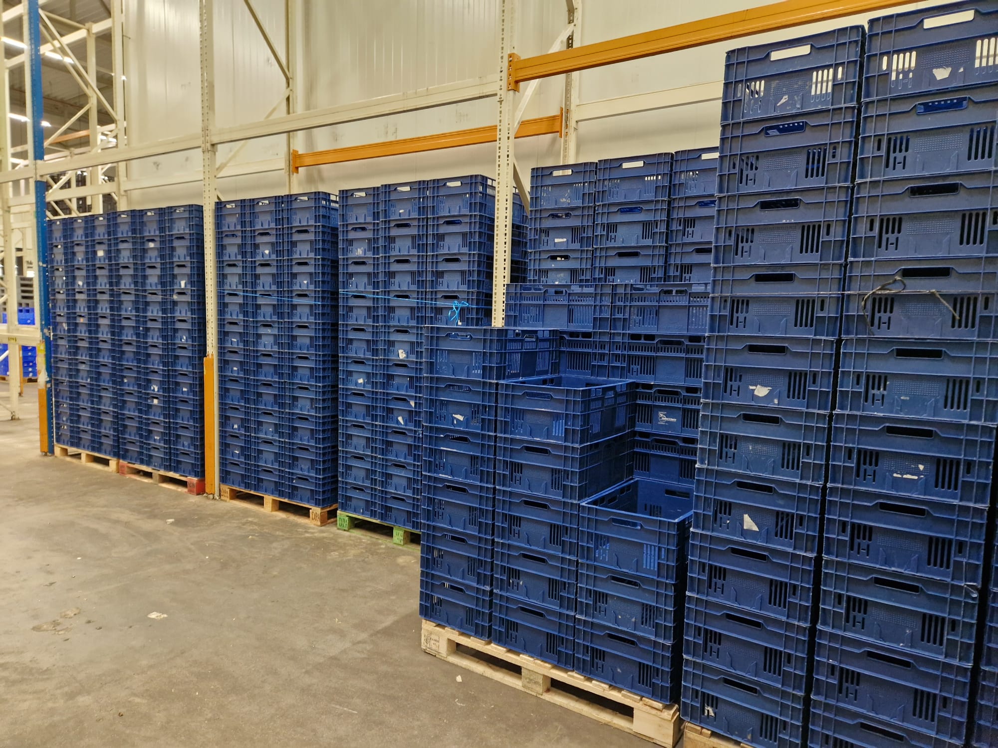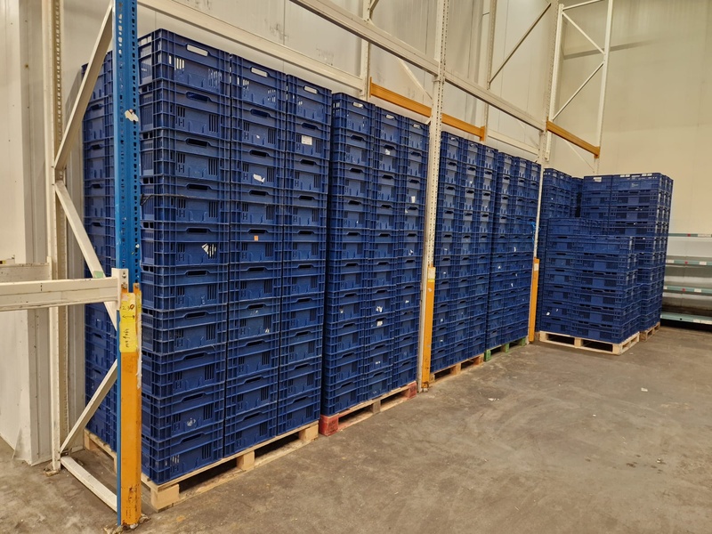 8 pallets with approximately 450 plastic crates, dimensions each crate: 600 mm x 400 mm x 230 mm.