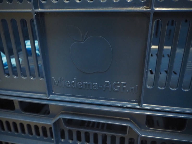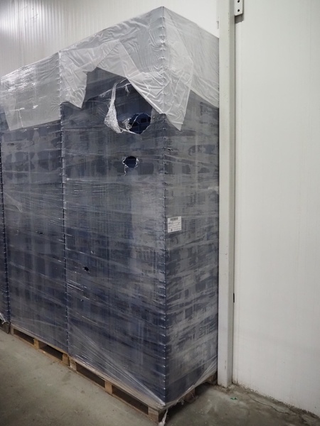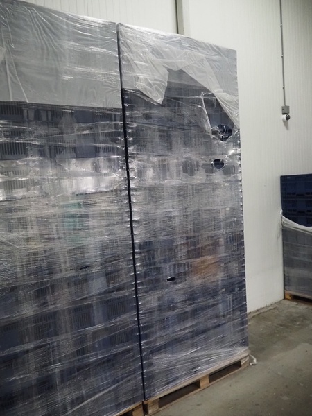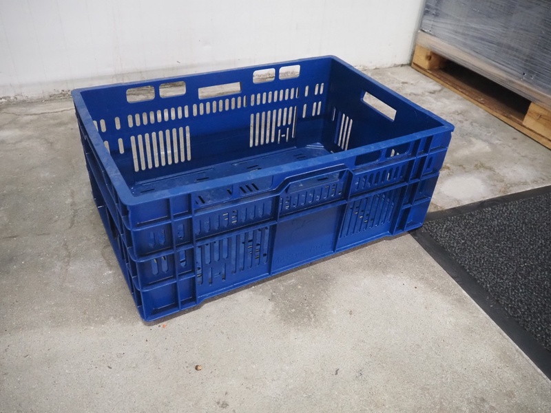 12 pallets with approximately 450 plastic crates, dimensions each crate: 600 mm x 400 mm x 230 mm.