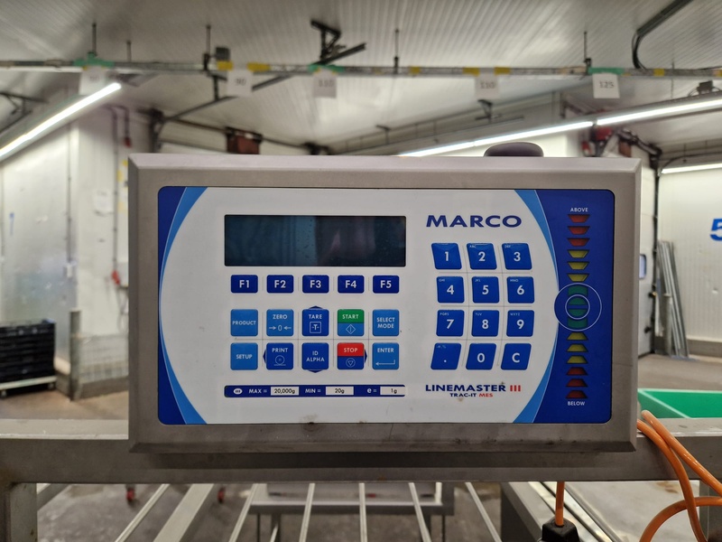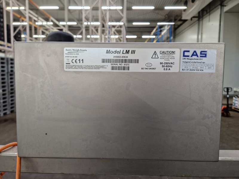 Avery Weigh Tronix weighing scale, model: LM III, serial number: 51273, 90-250 VAC, 50-60 Hz, 0.8 A, maximum: 20000 gram, minimum: 20 gram, e= 1 gram, dimensions scale: 440 mm x 400 mm, total dimensions: 1280 mm x 550 mm x 1780 mm.