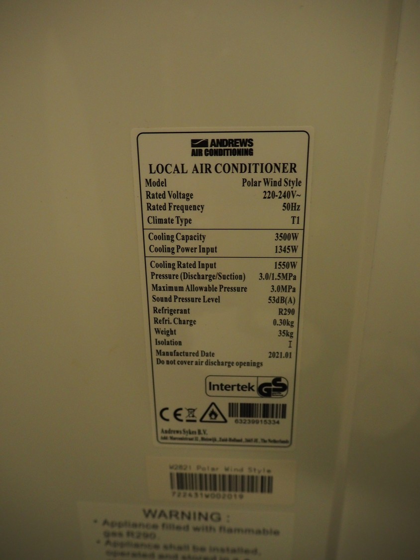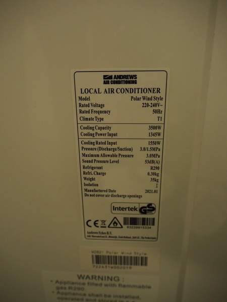Andrews air conditioning, model: Polar Wind Style, year of construction: 01/2021, 220/240 V, 1 Ph, 50 Hz, 1550 W, weight: 35 kg, refrigerant: R290, 0.30 kg, dimensions: 450 mm x 400 mm x 840 mm.
