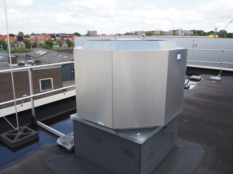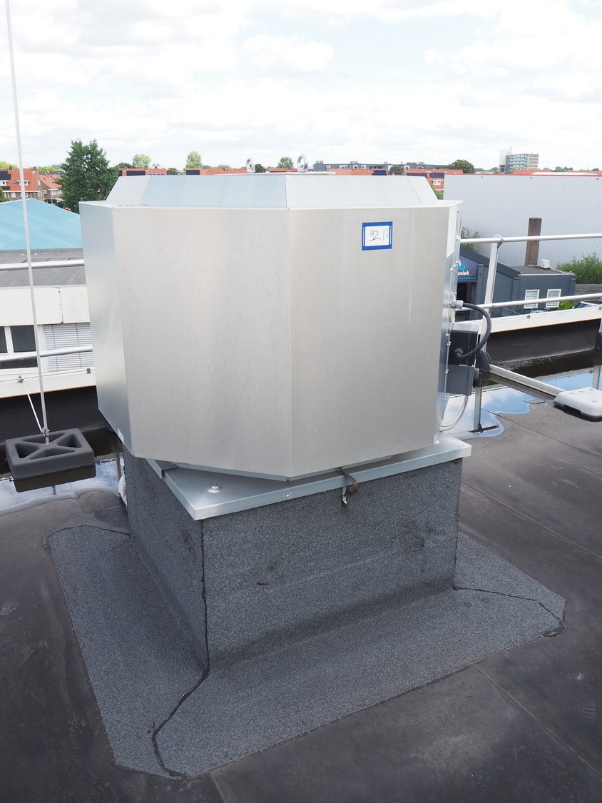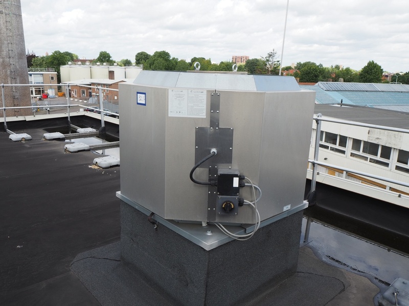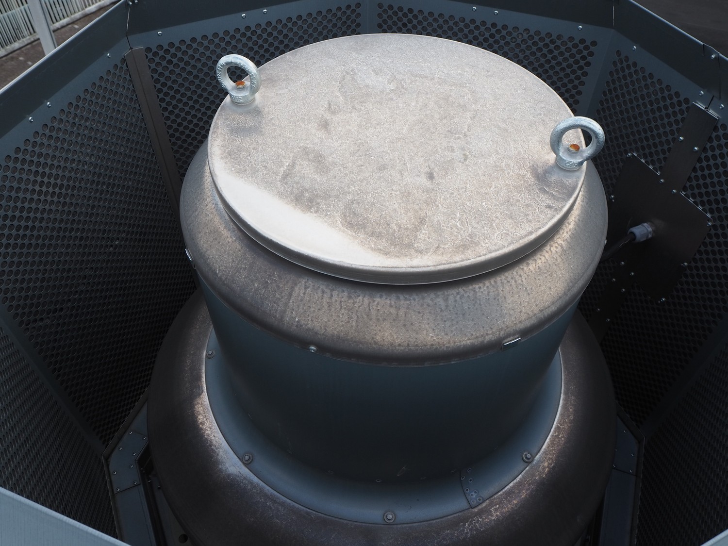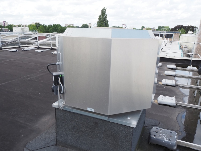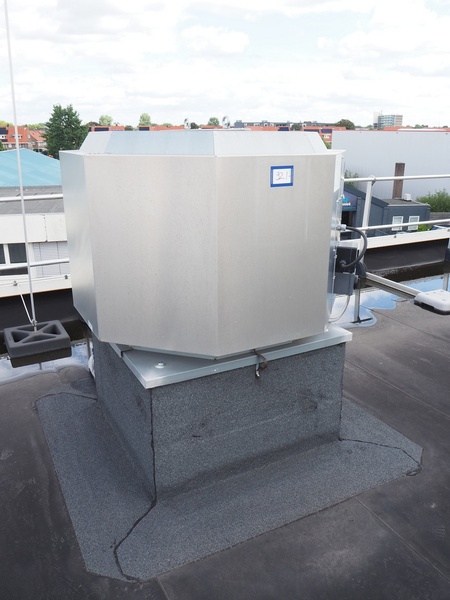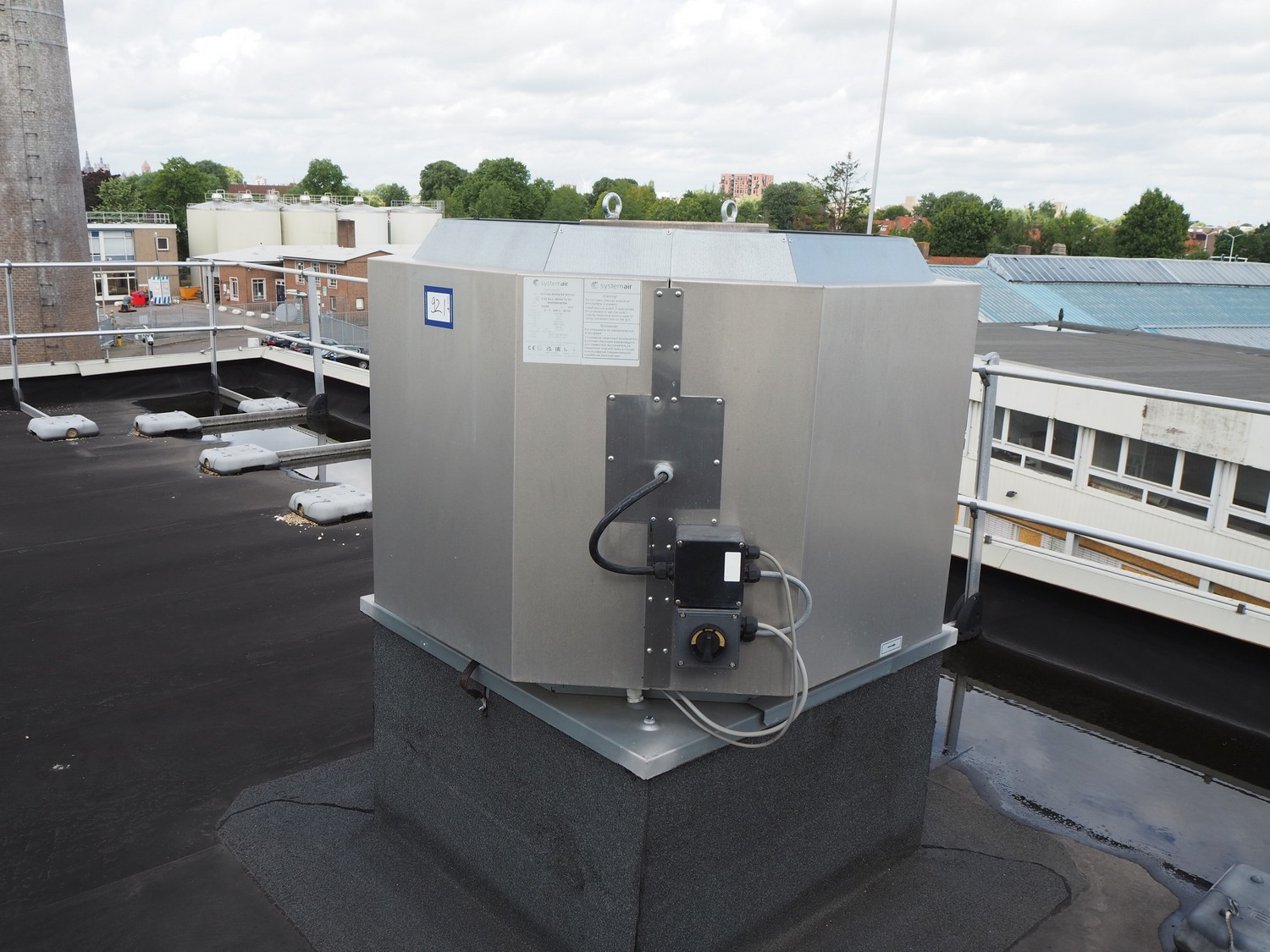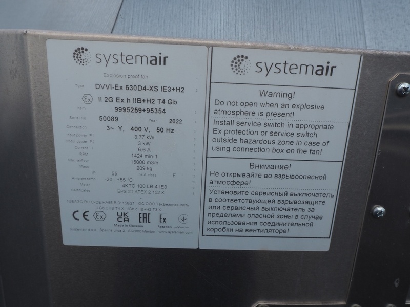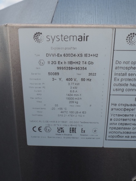 Systemair explosion proof roof fan, type: DVVI-Ex 630D4-XS IE3+H2, serial number: 50089, year of construction: 2022, 400 V, 3 Ph, 50 Hz, 6.6 A, 3 kW, 1424 rpm, weight: 209 kg, dimensions: 1300 mm x 1300 mm x 1550 mm.