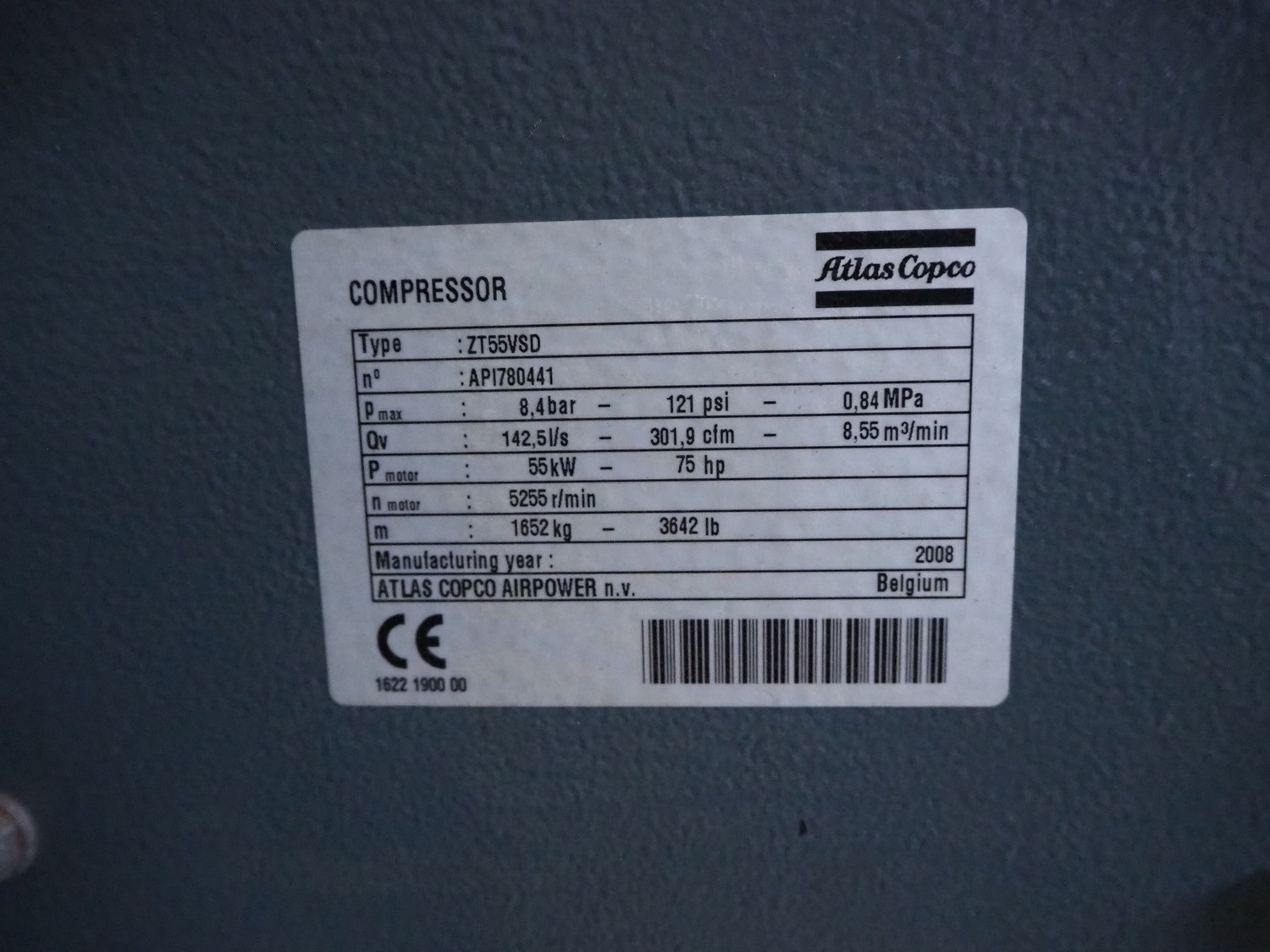 Atlas Copco screw compressor, type: ZT55VSD, number: API1780441, year of construction: 2008, 55 kW, 5255 r/min, capacity: 142.5 l/s, 8.55 m³/min, dimensions: 2440 mm x 1020 mm x 1880 mm.