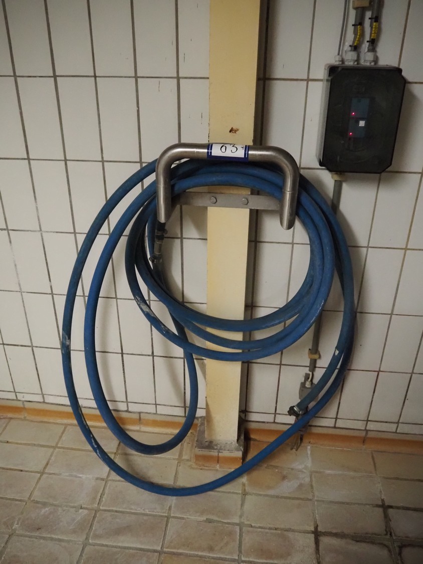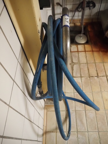 S/s hose reel with plastic hose, dimensions: 380 mm x 150 mm x 220 mm.