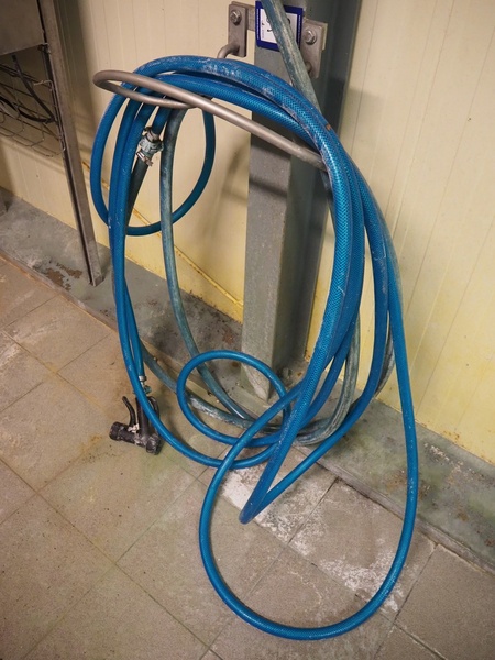 S/s hose reel with plastic hose and spray pistol, dimensions reel: 500 mm x 350 mm x 200 mm.