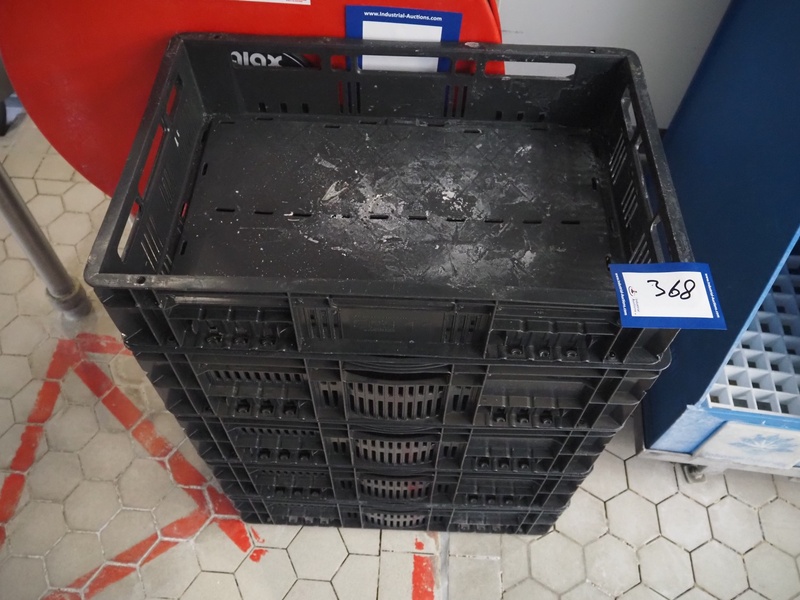 5 plastic crates, dimensions: (4x) 600 mm x 400 mm x 170 mm, (1x) 600 mm x 400 mm x 120 mm.