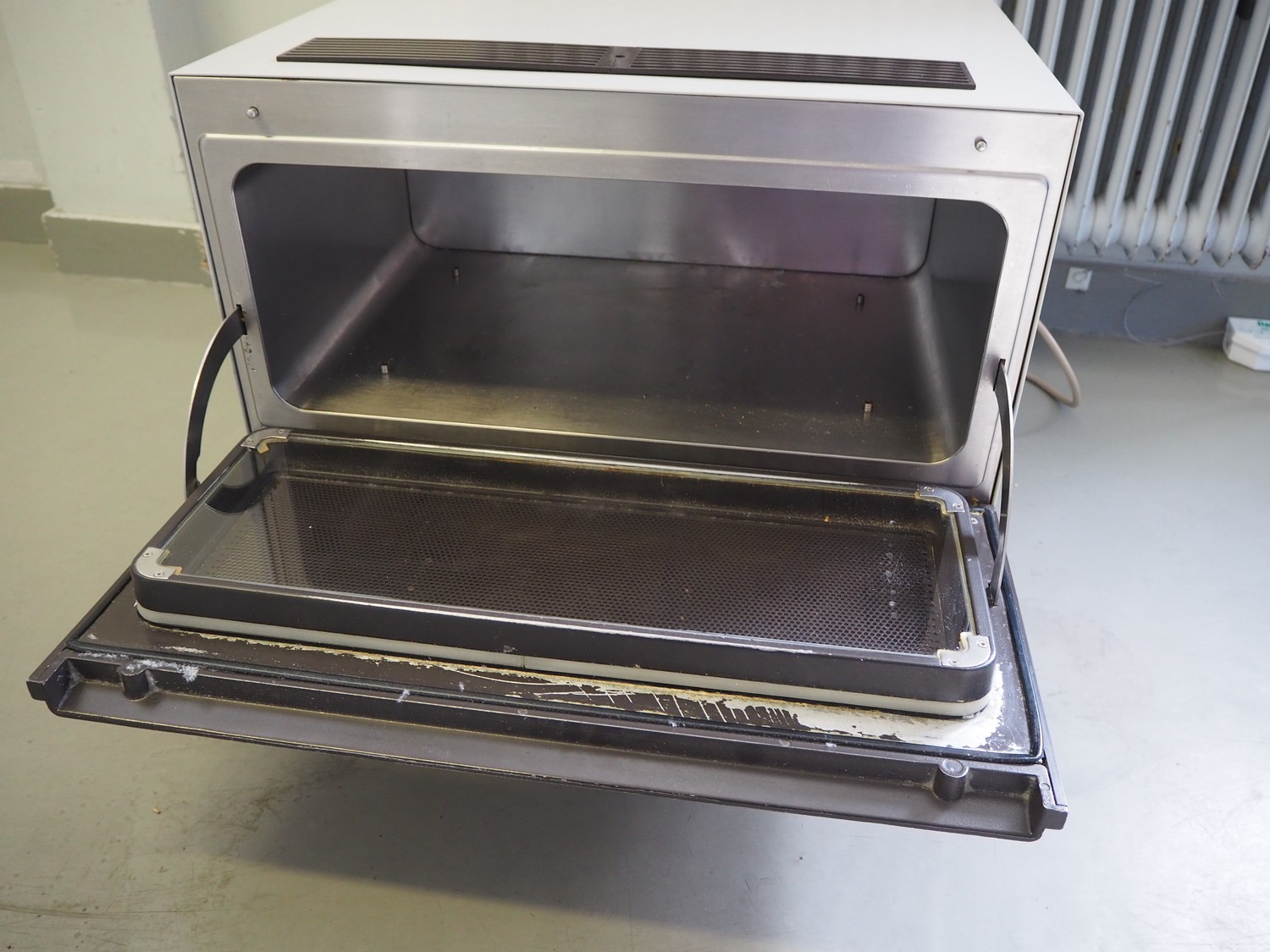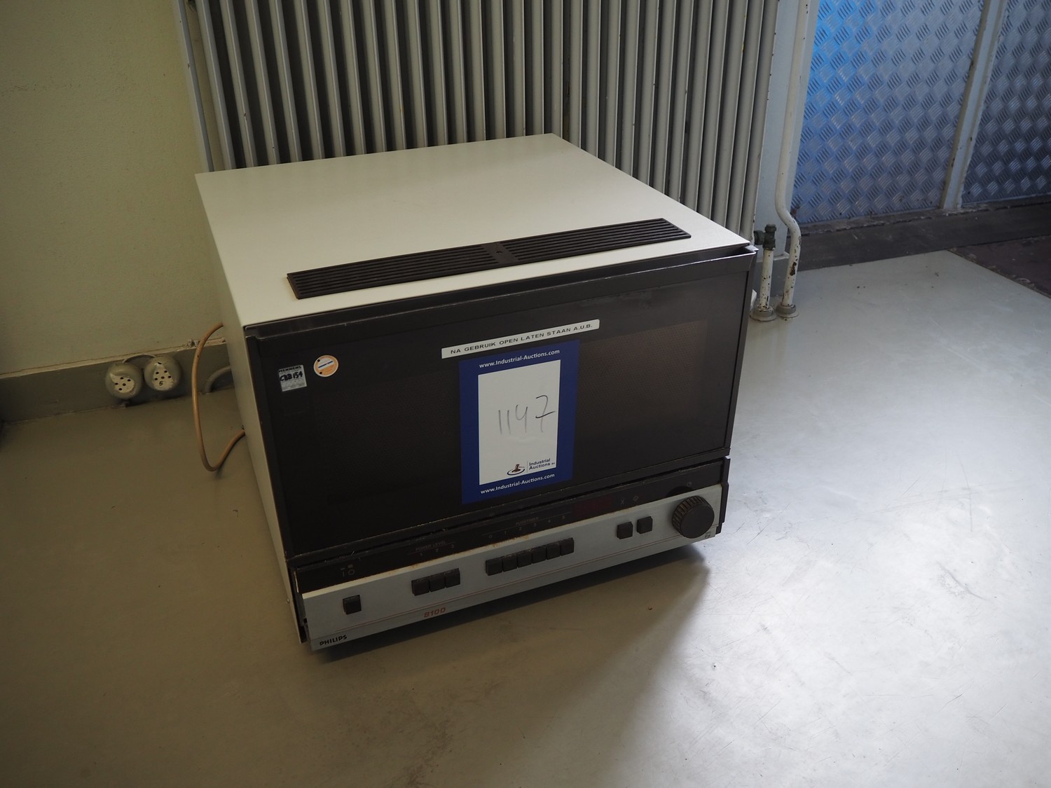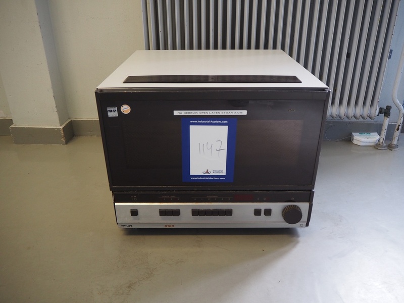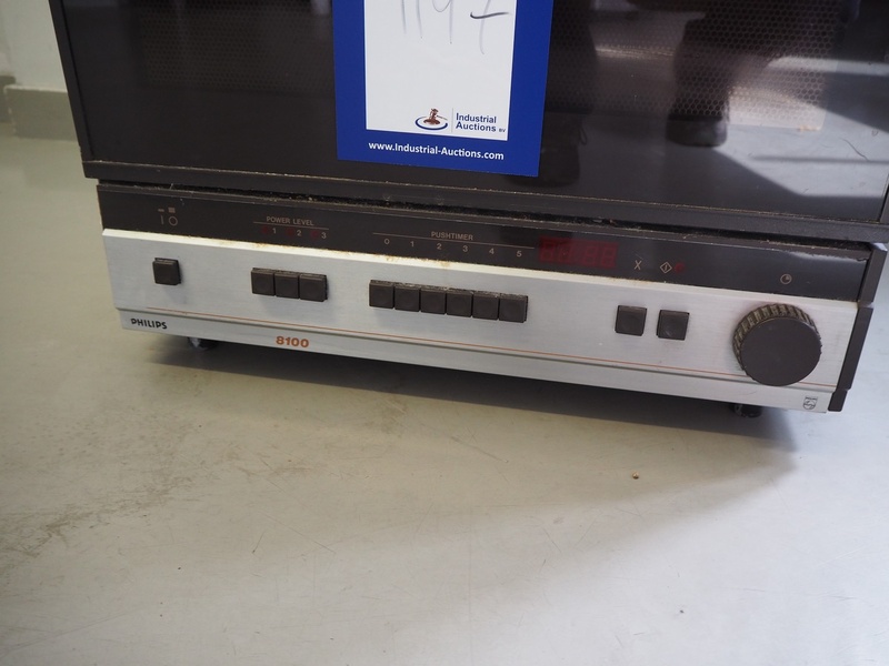 Philips microwave, type: AKB 115/PH/01, number: C-067/81, 220 V, 1 Ph, 50 Hz, 13 A, 2.7 kW, inside dimensions: 530 mm x 350 mm x 200 mm, total dimensions: 600 mm x 600 mm x 480 mm.