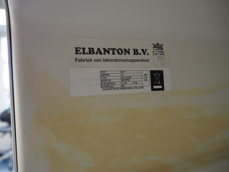 Elbanton B.V. laboratory refrigerator, type: SKV 2D 260, serial number: 200509900, year of construction: 2005, 230 V, 2 A, refrigerant: R 134a/110 gram, dimensions: 600 mm x 600 mm x 1230 mm.