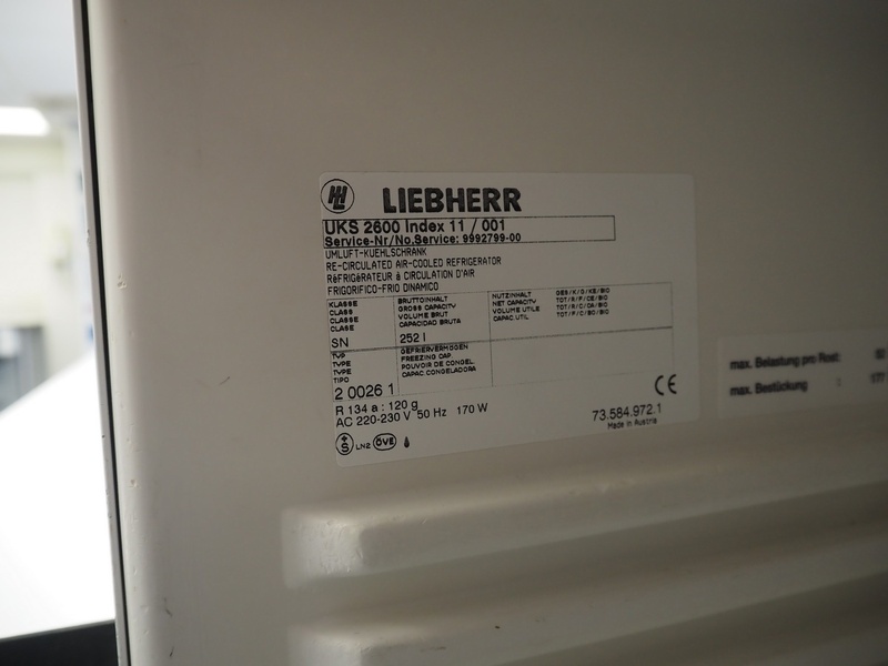 Liebherr refrigerator, type: UKS 2600 Index 11 / 001, serial number: 73.584.972.1, 220/230 V, 50 Hz, 170 W, refrigerant: R 134 a/120 g, volume: 252 litres, dimensions: 650 mm x 650 mm x 1230 mm.