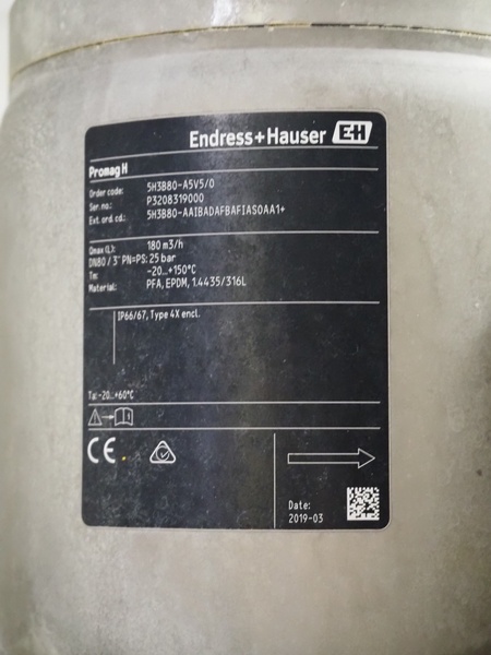 Endress + Hauser flowmeter, type: Promag H / Promag 300, year of construction: 2019-03, capacity: 180 m³/h, dimensions: 350 mm x 250 mm x 200 mm.