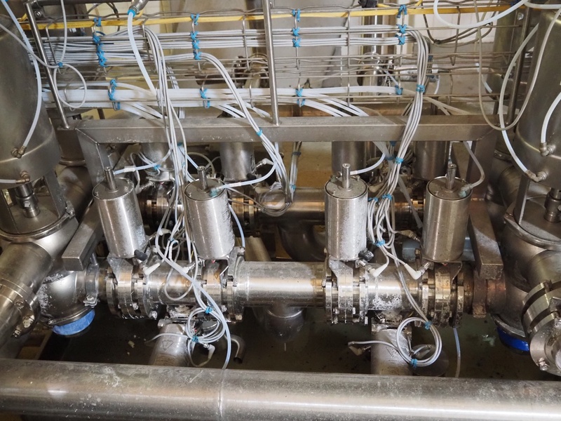 Manifold with 12 Alfa Laval valves and 4 regulators, dimensions: 1400 mm x 800 mm x 1300 mm.