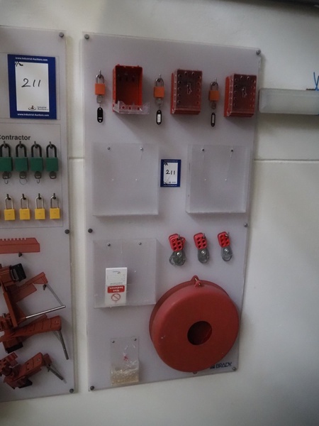 Lock-in / lock-out station, consisting of: 2 wall mounted boards with various locks, dimensions: 950 mm x 1300 mm and 650 mm x 1300 mm.