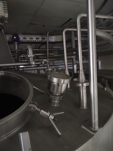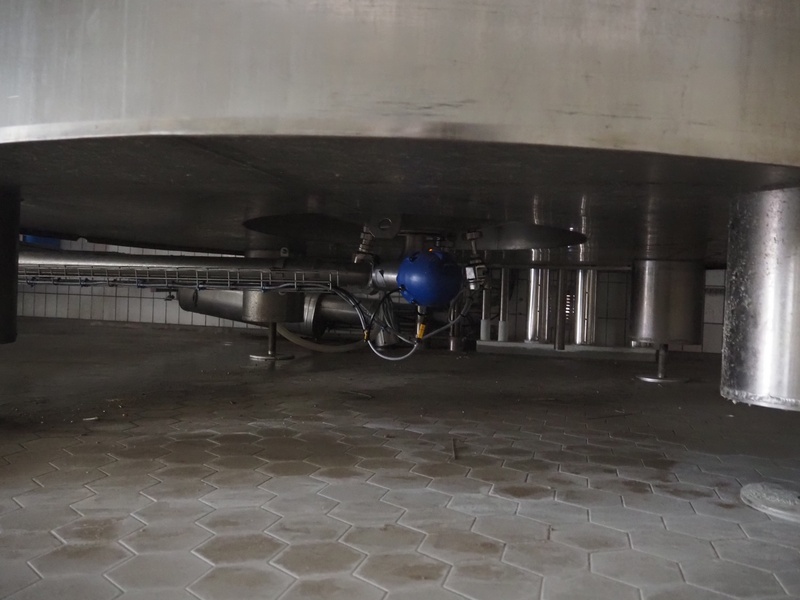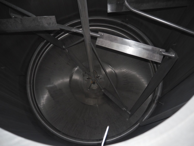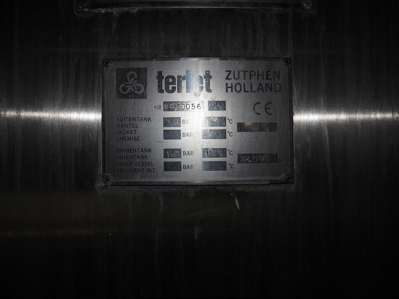 Terlet s/s insulated tank with agitator, number: 98.00056 3, volume: 12000 litres, maximum operating temperature: 100 °C, dimensions: Ø 2600 mm x 4600 mm. Tank is dented.