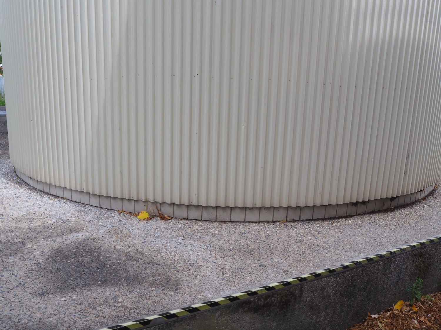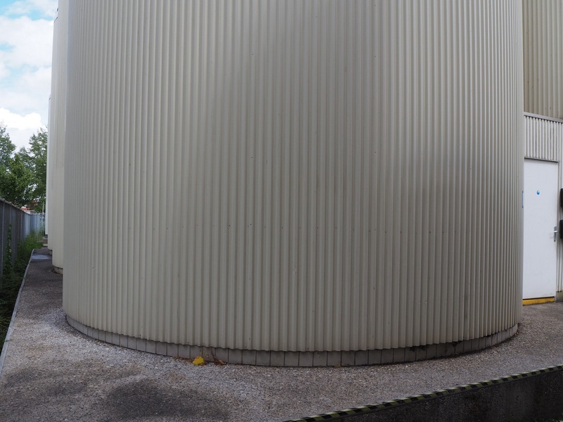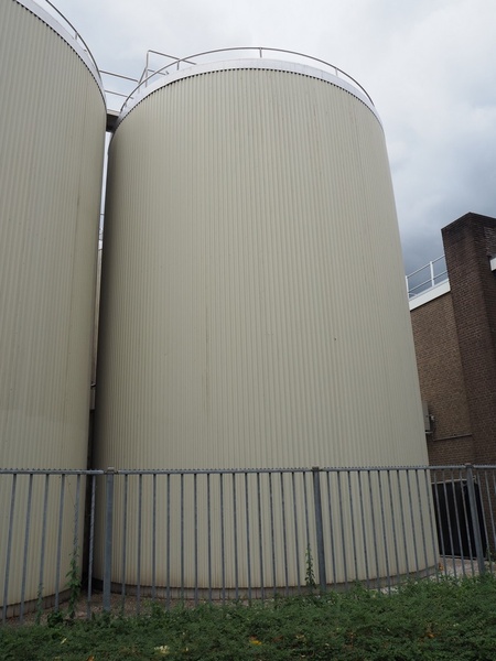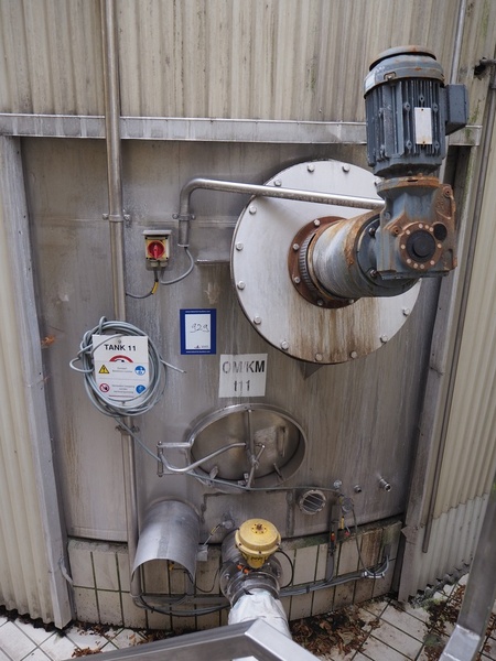 Insulated storage tank with mixing arm used for raw milk and butter milk, volume: approximately 230.000 litre, dimensions: Ø 6300 mm x 10750 mm.