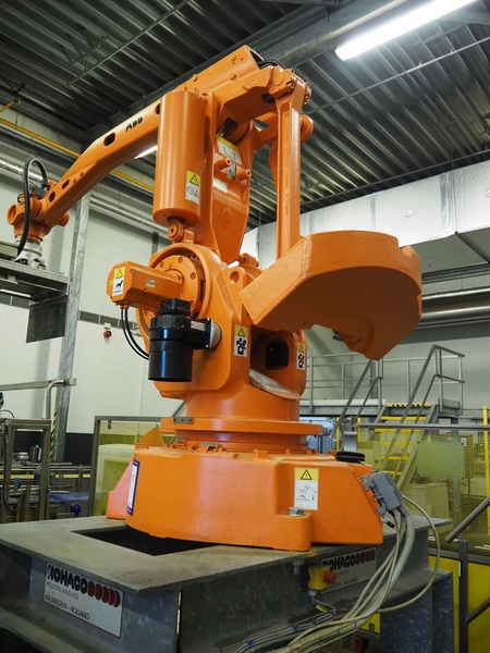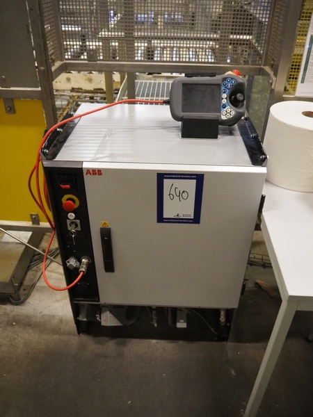 ABB palletizing robot, consisting of:Infeed belts for boxes, belt width: 460 mm;Outfeed roller conveyors for pallets, roller width: 1000 mm;ABB palletizing robot, type robot: IRB 640 M2000, serial number: 64Z-20274, year of construction: 2018/12/12, weight: 1950 kg, type control cabinet: IRC5 M2004, serial number: 6640-102812. year of construction: 2024/10/23, 400 V, 3 Ph, 50-60 Hz, 20 A, weight: 150 kg, dimensions robot: 1800 mm x 950 mm x 3600 mm, dimensions control cabinet: 700 mm x 580 mm x 900 mm;Total floor dimensions: 8000 mm x 5000 mm.