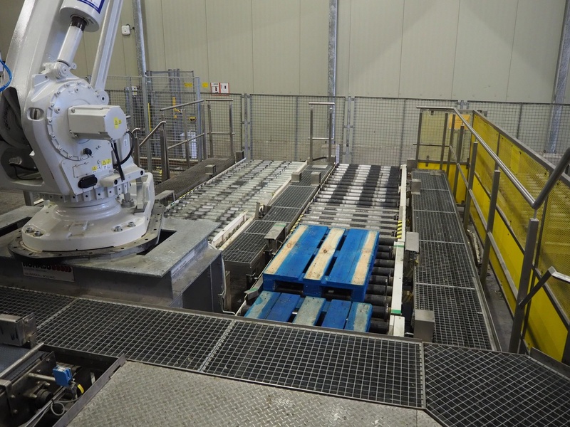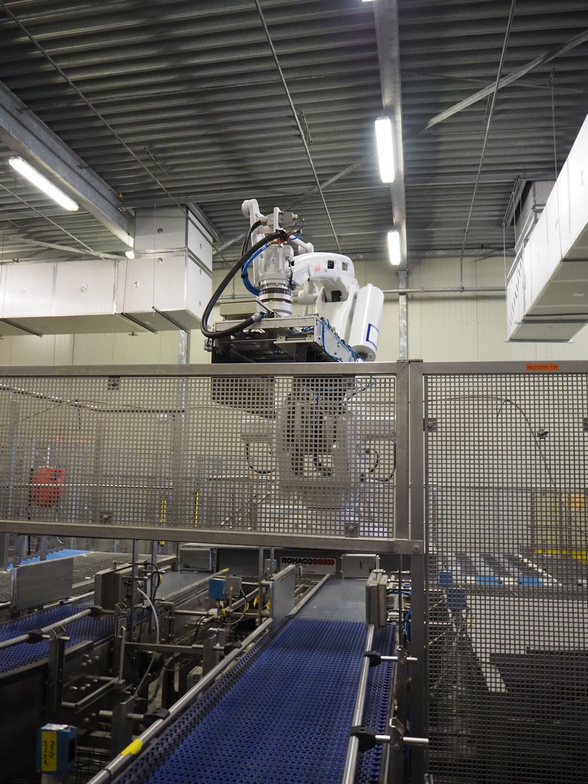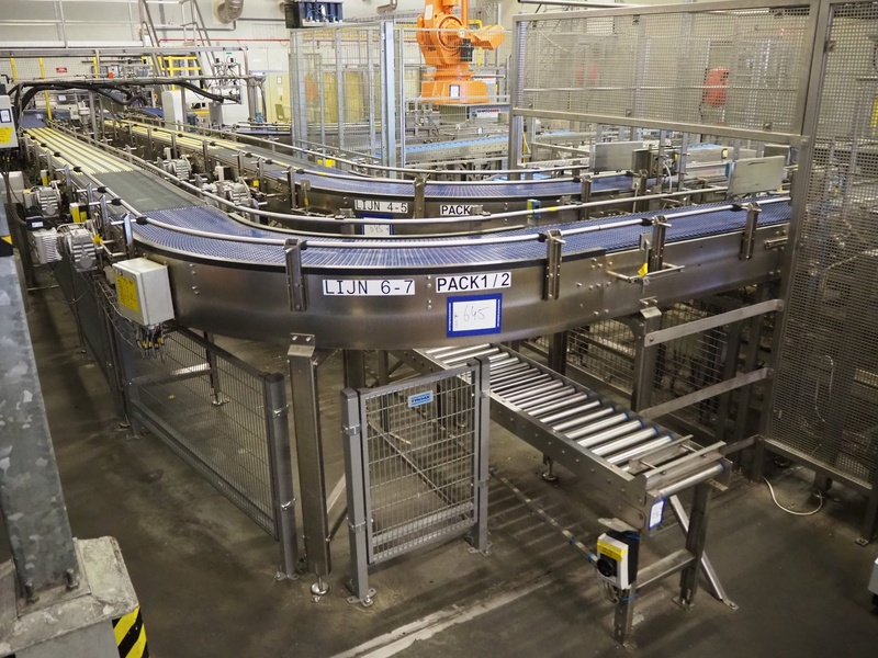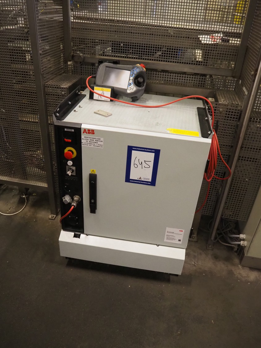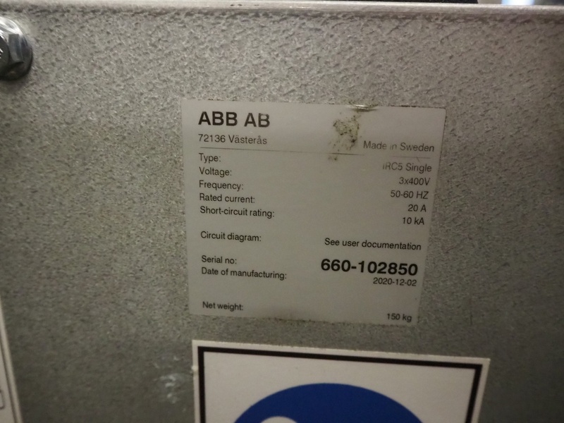 ABB palletizing robot, consisting of:Infeed belts for boxes, belt width: 460 mm;Outfeed roller conveyors for pallets, roller width: 1100 mm;ABB palletizing robot, type robot: IRB 660 M2000, serial number: 660-102850, year of construction: 2020-12-02, weight: 1750 kg, type control cabinet: IRC5 Single, serial number: 660-102850. year of construction: 2020-12-02, 400 V, 3 Ph, 50-60 Hz, 20 A, weight: 150 kg, dimensions robot: 1800 mm x 2800 mm x 3750 mm, dimensions control cabinet: 700 mm x 580 mm x 900 mm;Total floor dimensions: 8000 mm x 7000 mm.