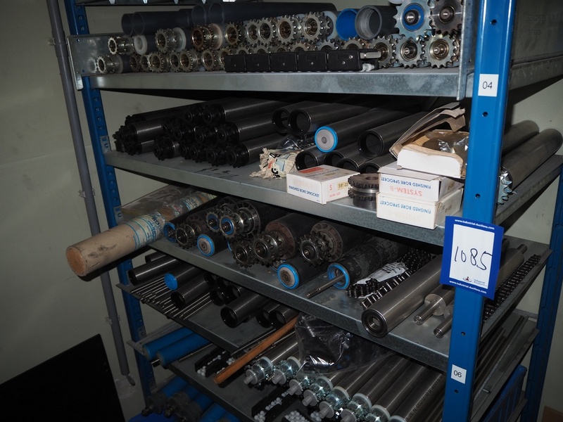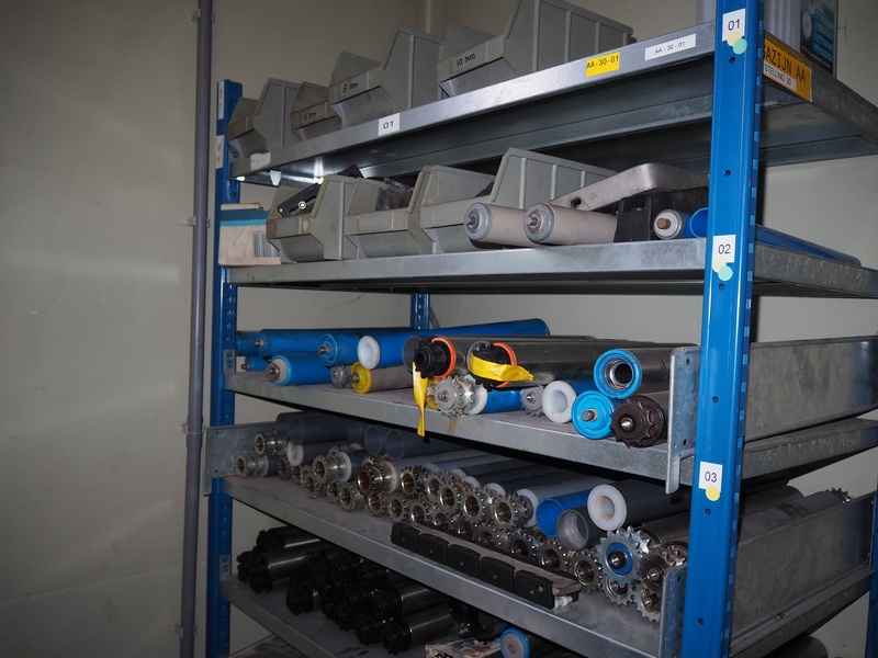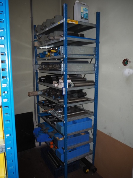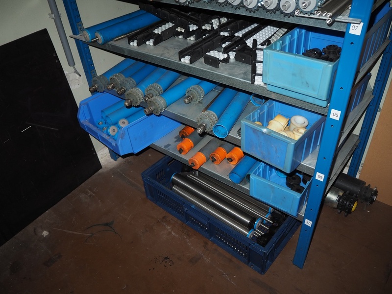 Steel rack with large amount of plastic and s/s rollers for roller conveyors, dimensions: 1050 mm x 530 mm x 2200 mm.