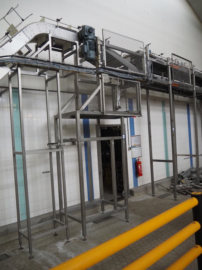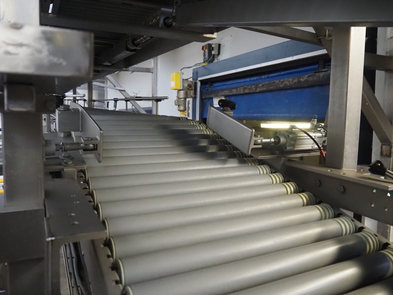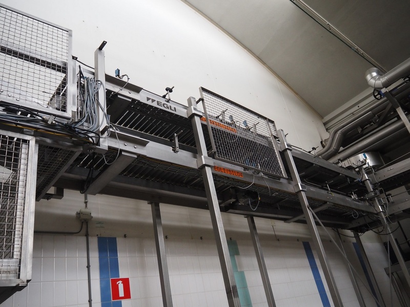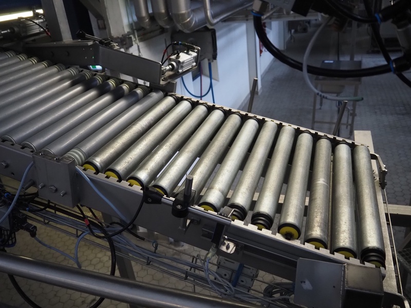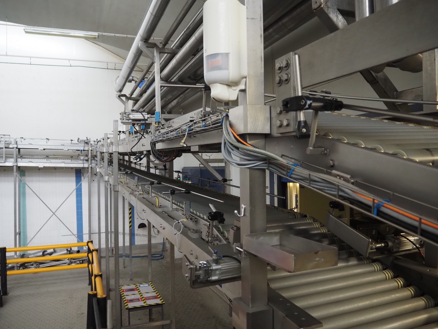 Egli double lane ellectricaly driven roller conveyor, plastic and s/s rollers, roller width: 480 mm, total dimensions: 7000 mm x 850 mm x 4100 mm, 14800 mm x 1100 mm x 4100 mm.