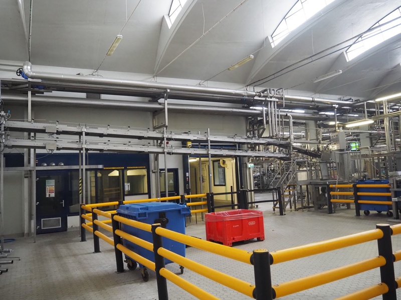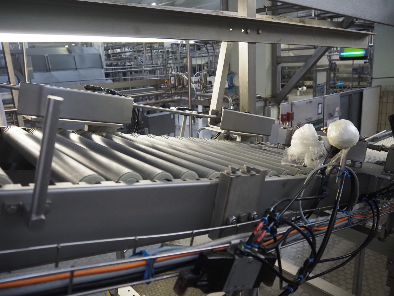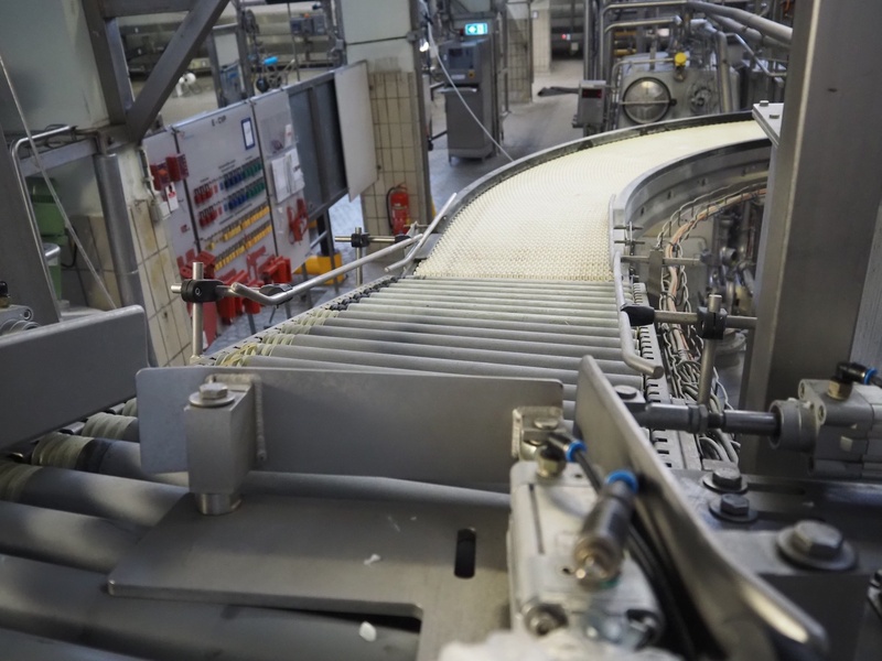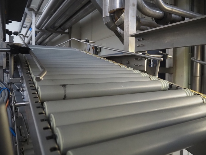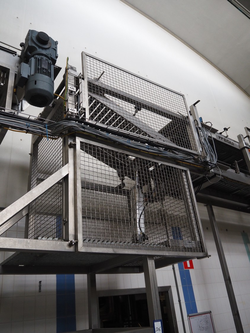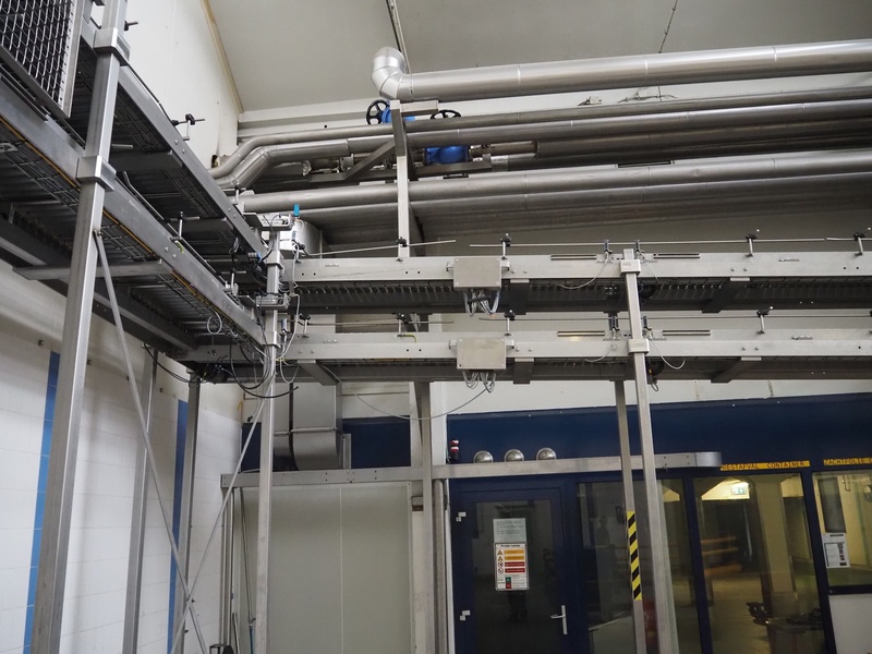 Egli double lane ellectricaly driven roller conveyor, plastic and s/s rollers, roller width: 480 mm, total dimensions: 7000 mm x 850 mm x 4100 mm, 14800 mm x 1100 mm x 4100 mm.