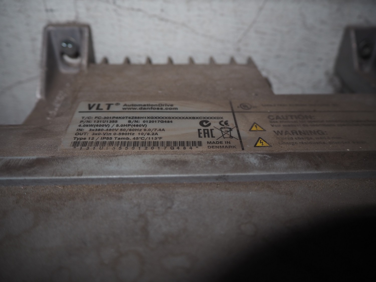 2 Danfoss frequency converters, 380-480 V, 3 Ph, 50/60 Hz, 9/7.4 A, 4 kW, dimensions: (2x) 180 mm x 180 mm x 390 mm.