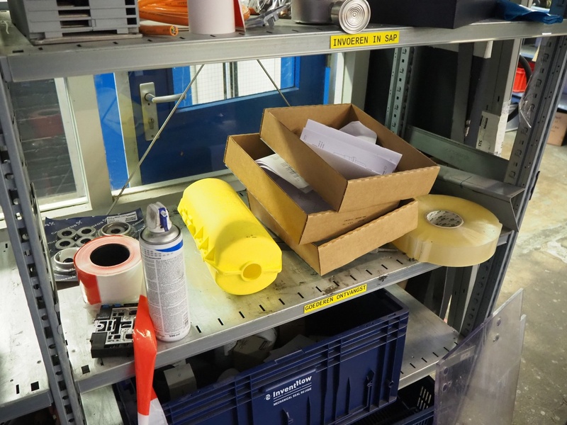 Steel rack with various parts, 14 floors, floor dimensions: 1000 mm x 500 mm, total dimensions: 2100 mm x 500 mm x 2300 mm.