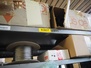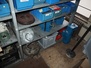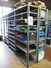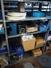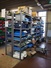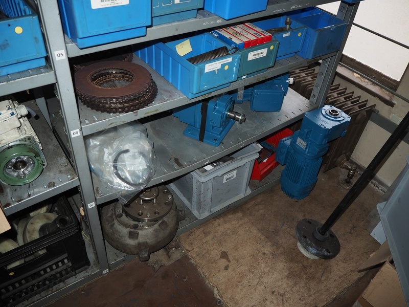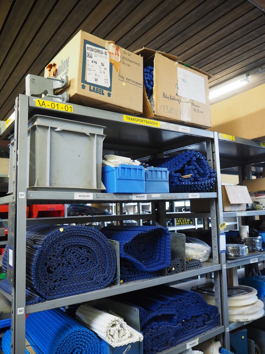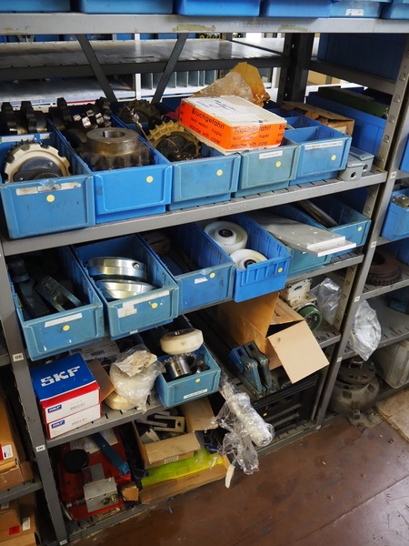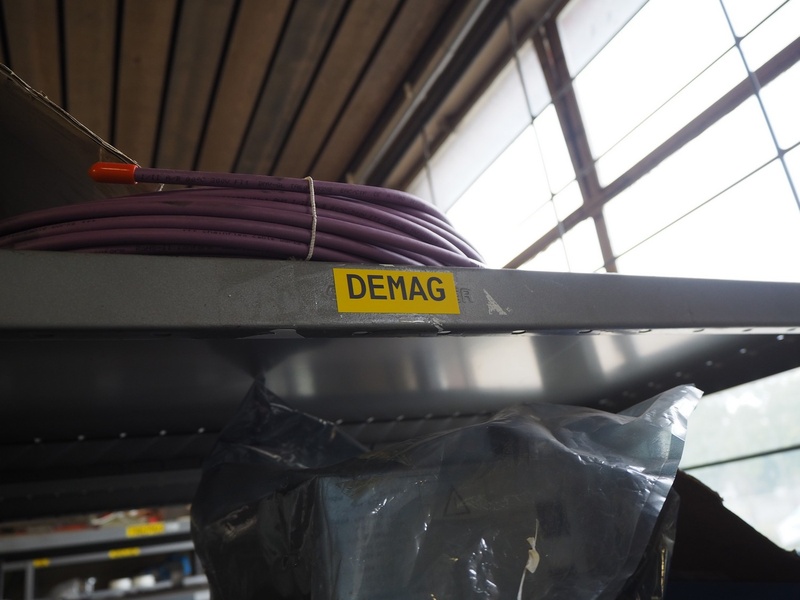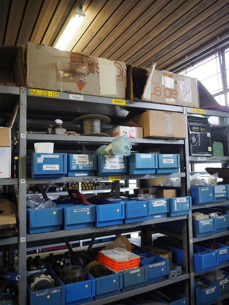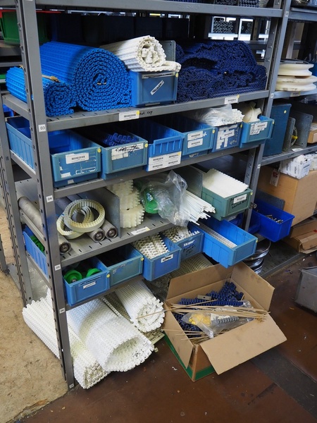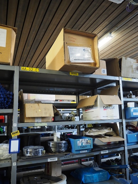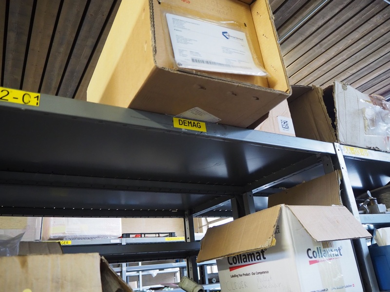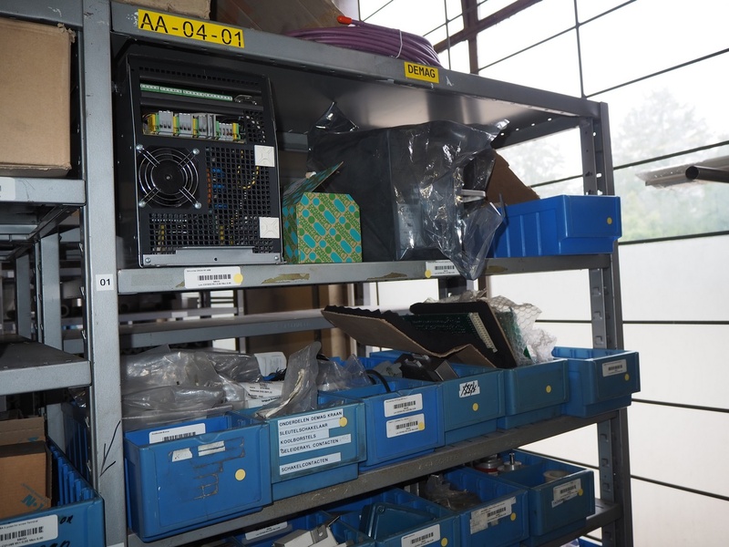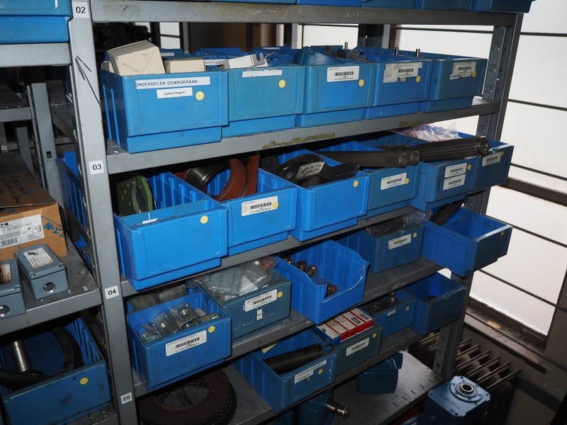 2 steel racks with various transport belts, Demag spare parts and spare parts for robots, dimensions: (2x) 4100 mm x 500 mm x 2180 mm.