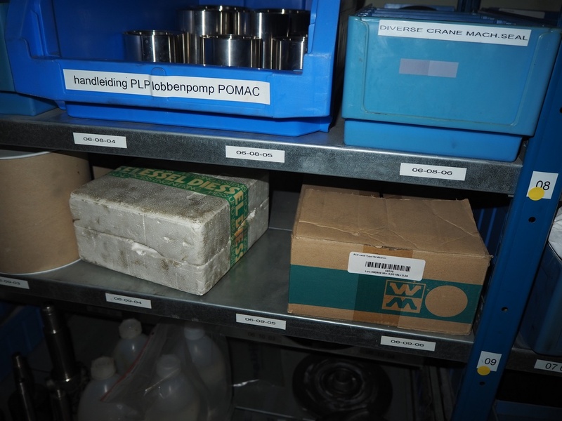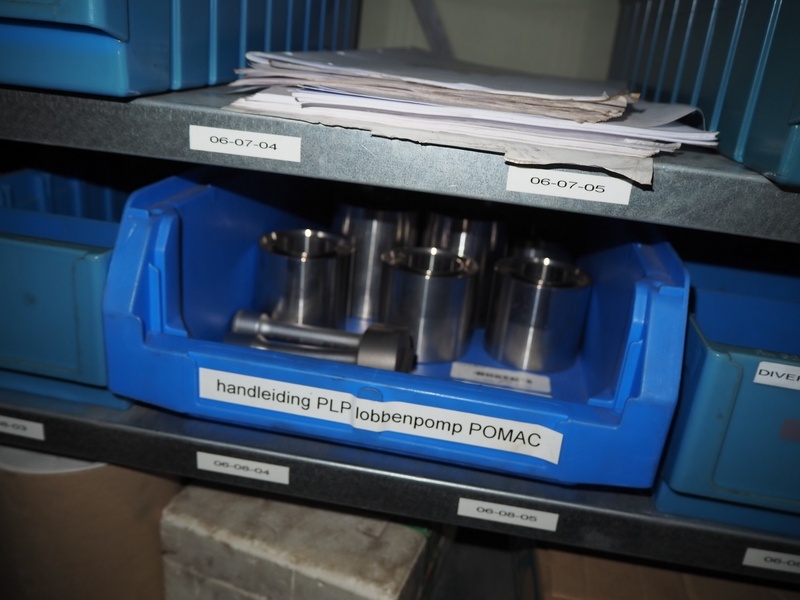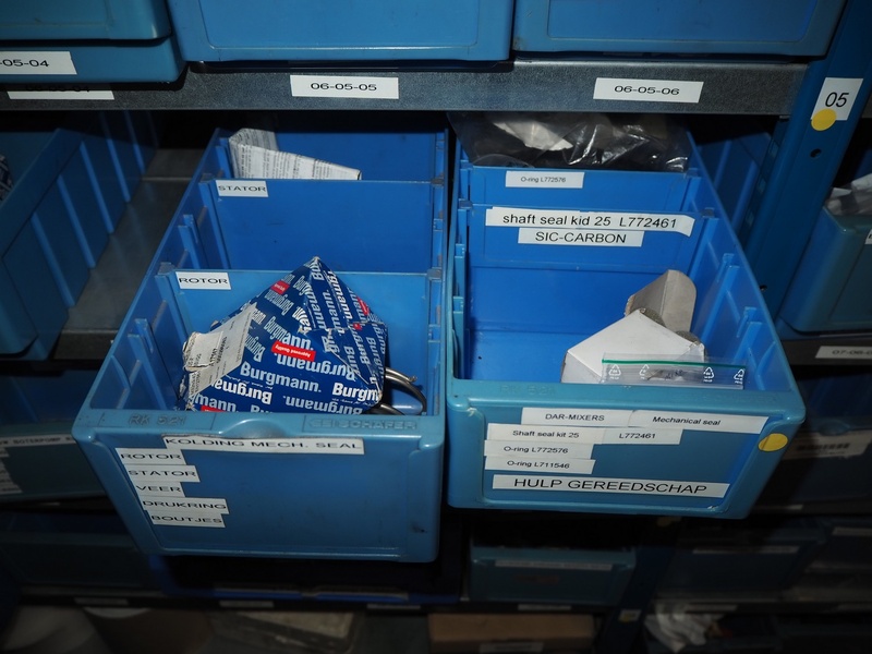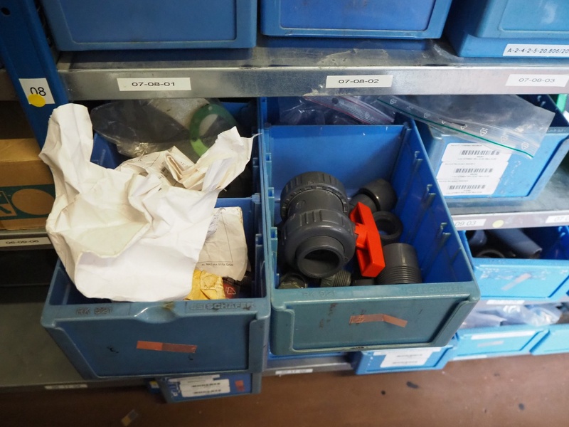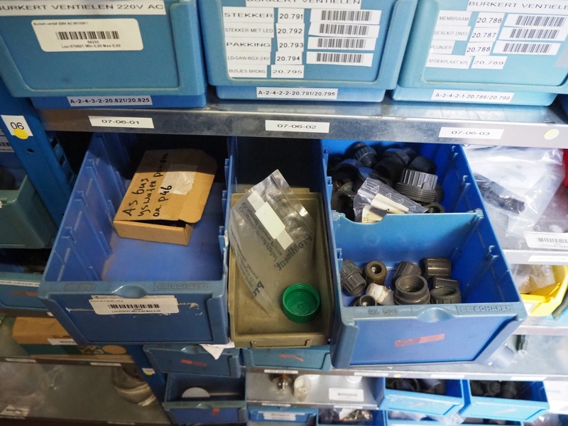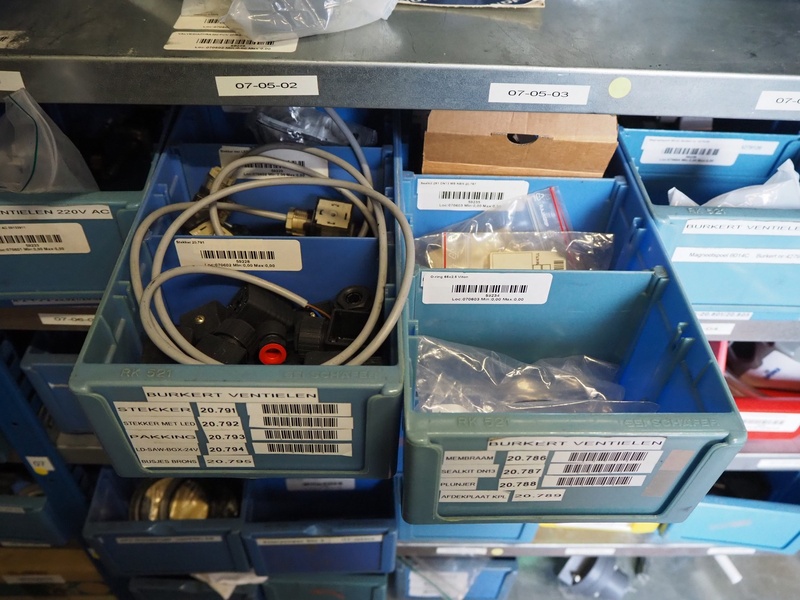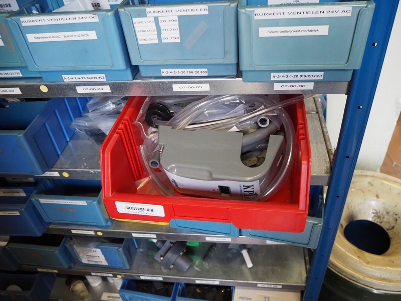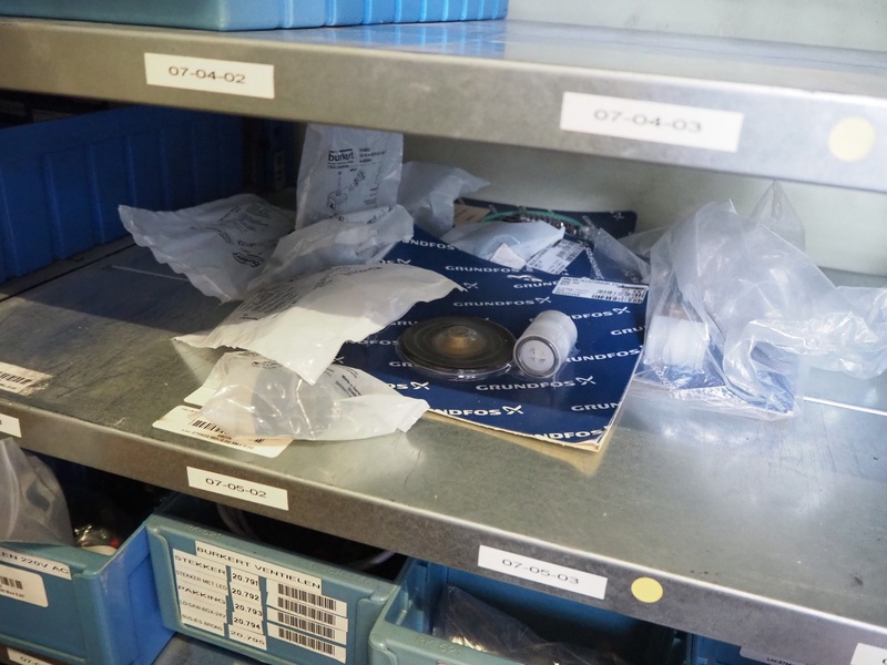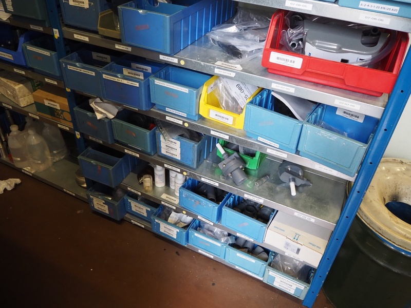 Steel rack with Burkert, Grundfos, and APV parts, dimensions: 2050 mm x 500 mm x 2200 mm.