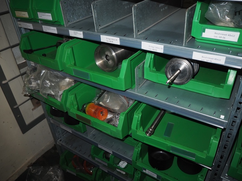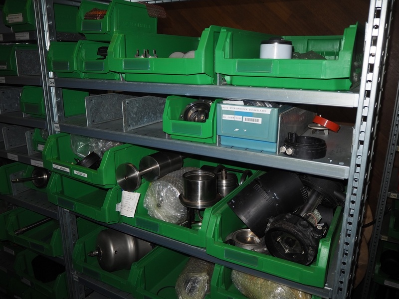 2 steel racks with various spare parts for valves, dimensions: (2x) 1060 mm x 500 mm x 2300 mm.