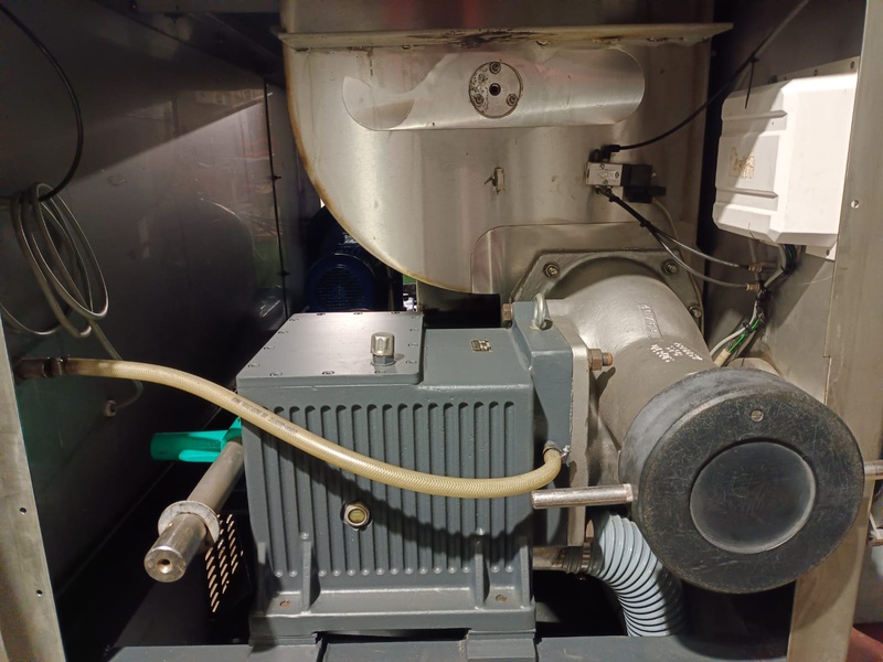 Kramer + Grebe mixer-grinder with lifter for 200 liter meat bins, type: MW160, machine number: 350/106, year of construction: 1993, lifting height: 2150 mm, plate ø: 160 mm, total dimensions: 2300 mm x 2150 mm x 2700 mm. Refurbished in 2025.