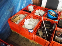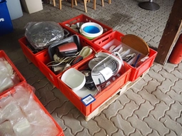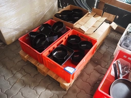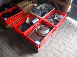 Pallet with 6 plastic crates with catering equipment, dimensions: 1200 mm x 800 mm x 600 mm.0 bidsLot is closed -