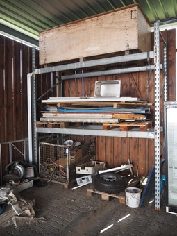 Steel pallet rack with various doors and wooden box, dimensions pallet rack, 1100 mm x 3150 mm, beam width: 2700 mm.0 bidsLot is closed